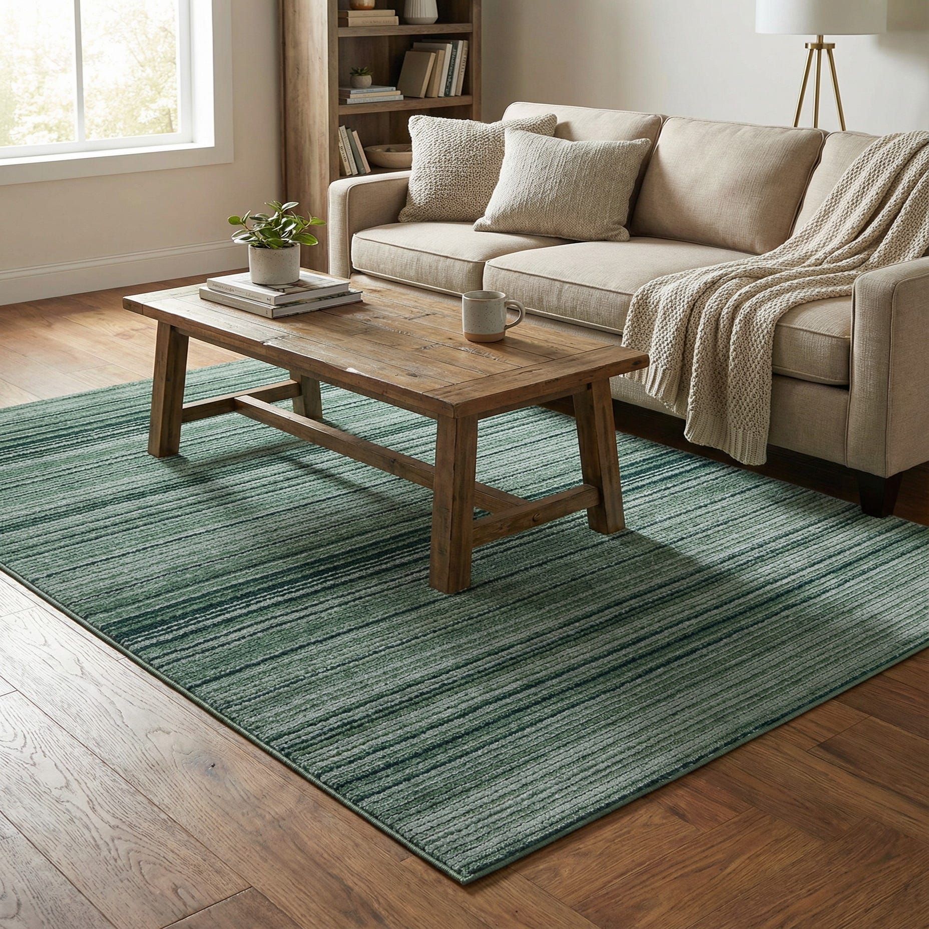 Place this rug in contemporary or transitional rooms where color and pattern need to stay grounded—a living room with warm wood furniture, a home office with metal accents, or layered in a bedroom to add quiet pattern without overwhelming. It also pairs nicely with neutral linens, navy or charcoal upholstery, and natural elements like woven baskets and houseplants to bring the green palette together. The stripe orientation can help elongate a narrow space when positioned lengthwise.