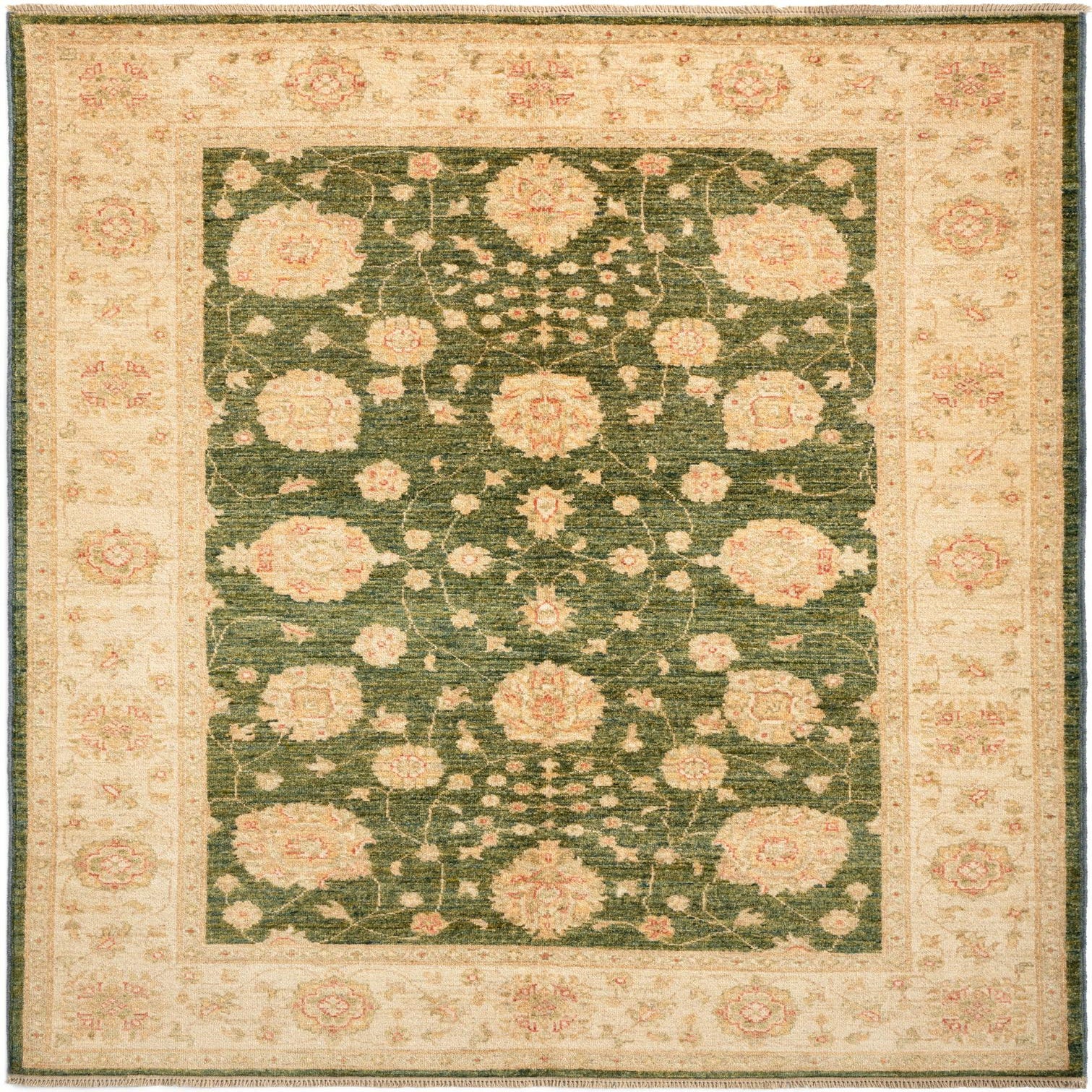 The Kaizar Collection offers a 4x6 hand-made rug crafted from 100% wool, presenting a marriage of traditional sensibilities with enduring style. The pattern showcases a lattice of floral motifs in a symmetrical arrangement, imbued with a palette of green, beige, and complementary accents on a green background. This design exudes a classic charm with a refreshing twist, thanks to its modern color interpretation.