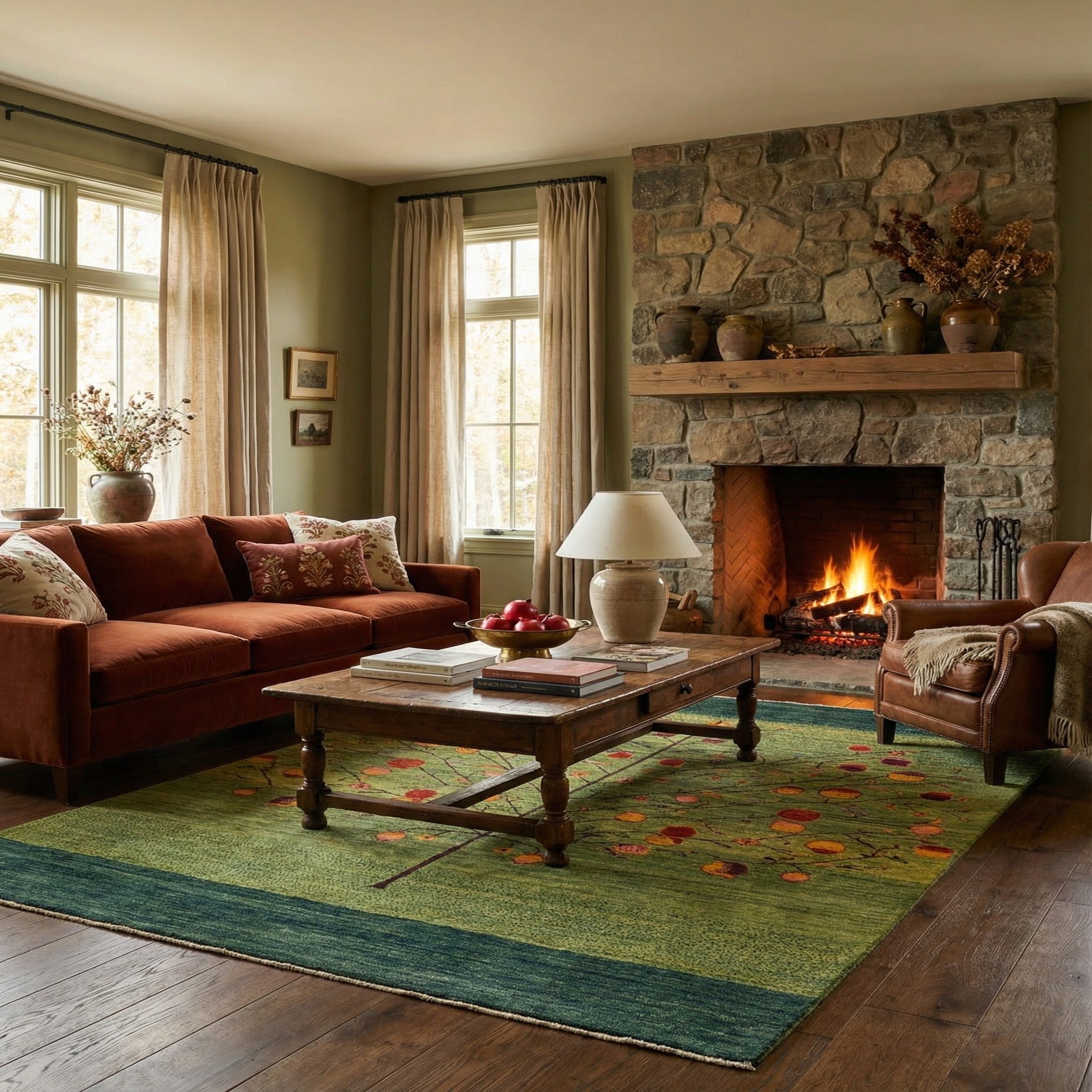 This rug anchors spaces that benefit from a warm, organic focal point: place it under a coffee table to ground a living room with walnut or oak furniture, layer it at the foot of a bed to bring color to neutral linens, or use it in an entry to set a welcoming tone. It pairs well with mid-century silhouettes, relaxed modern furnishings, and eclectic mixes of leather, brass, woven textures and greenery, adding both pattern and a tactile, handcrafted presence to the room.