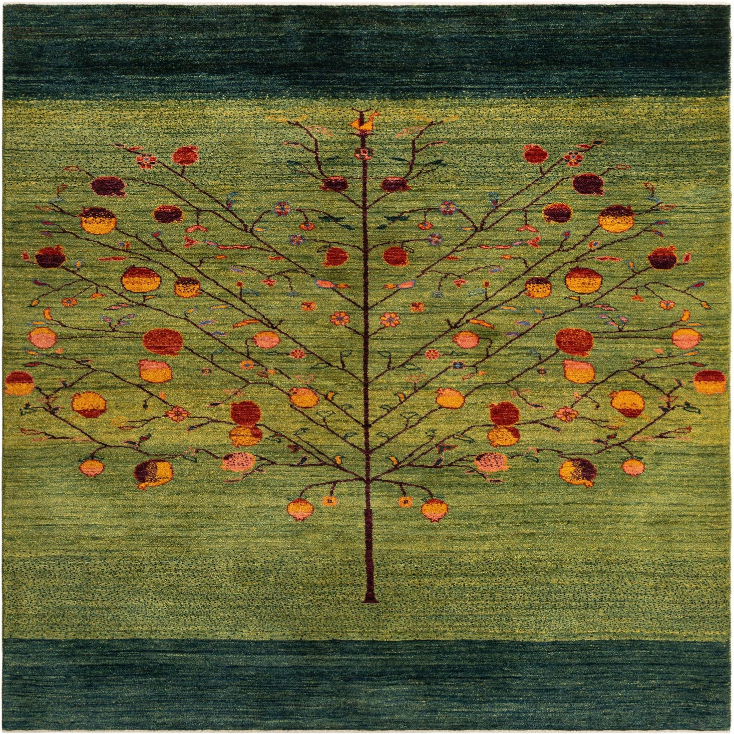 A 4x6 rectangular green wool rug featuring a large, stylized tree with colorful fruit and small birds, set against a striped green background.