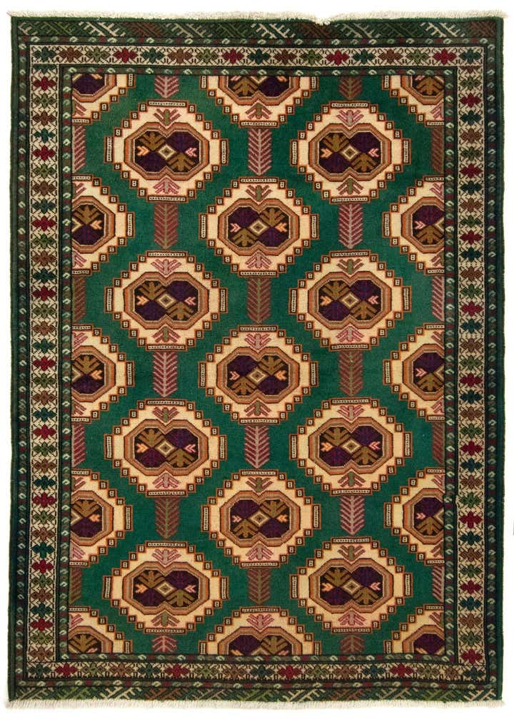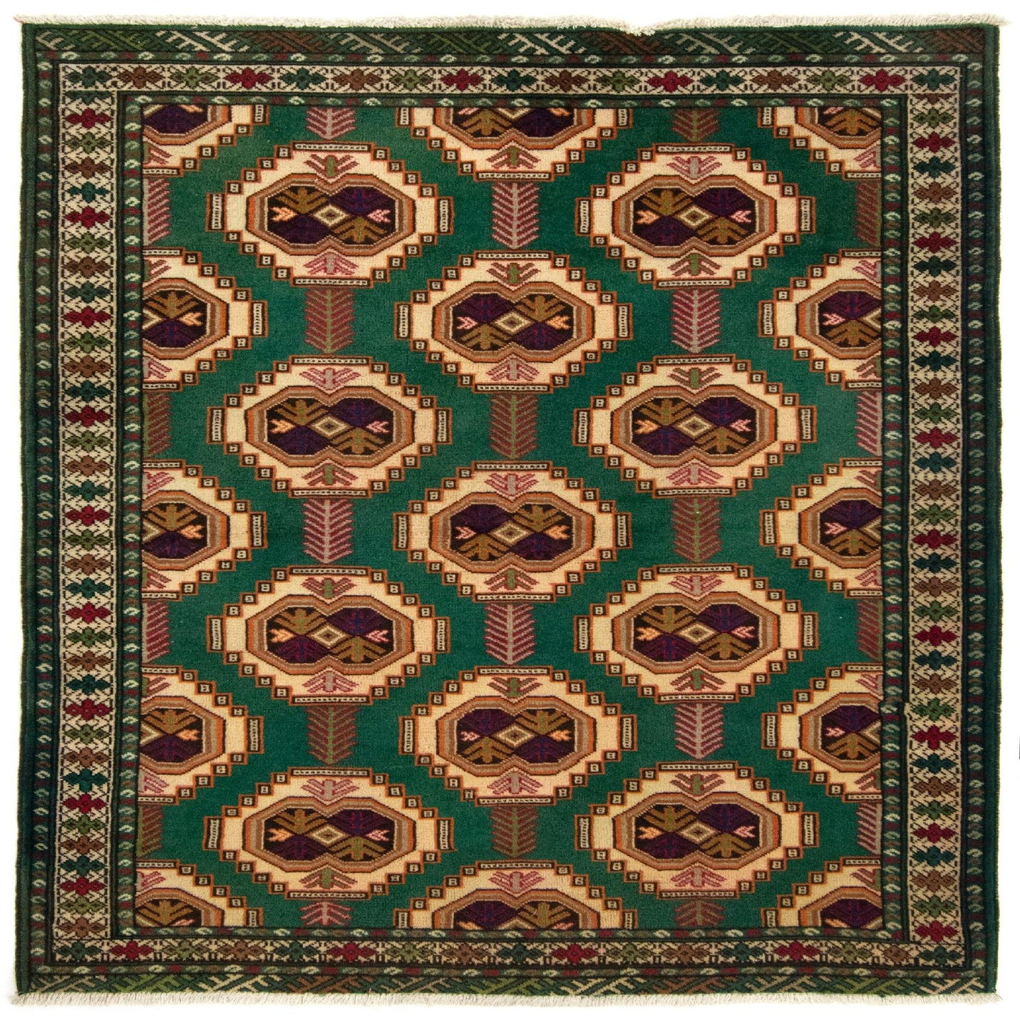 The Lambaran collection presents a hand-knotted rug woven from 100% wool, which provides a naturally plush texture underfoot. This 4x6 piece showcases a rich, green background, with a pattern that features a geometric medley of orange, red, brown, and beige hues. The symmetrical arrangement of octagonal shapes is framed by detailed borders, creating a tapestry of traditional motifs.