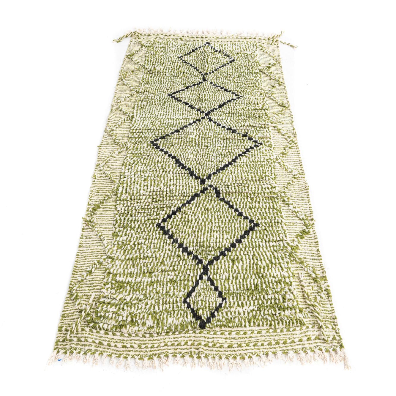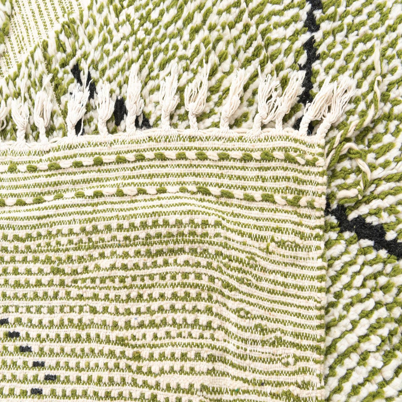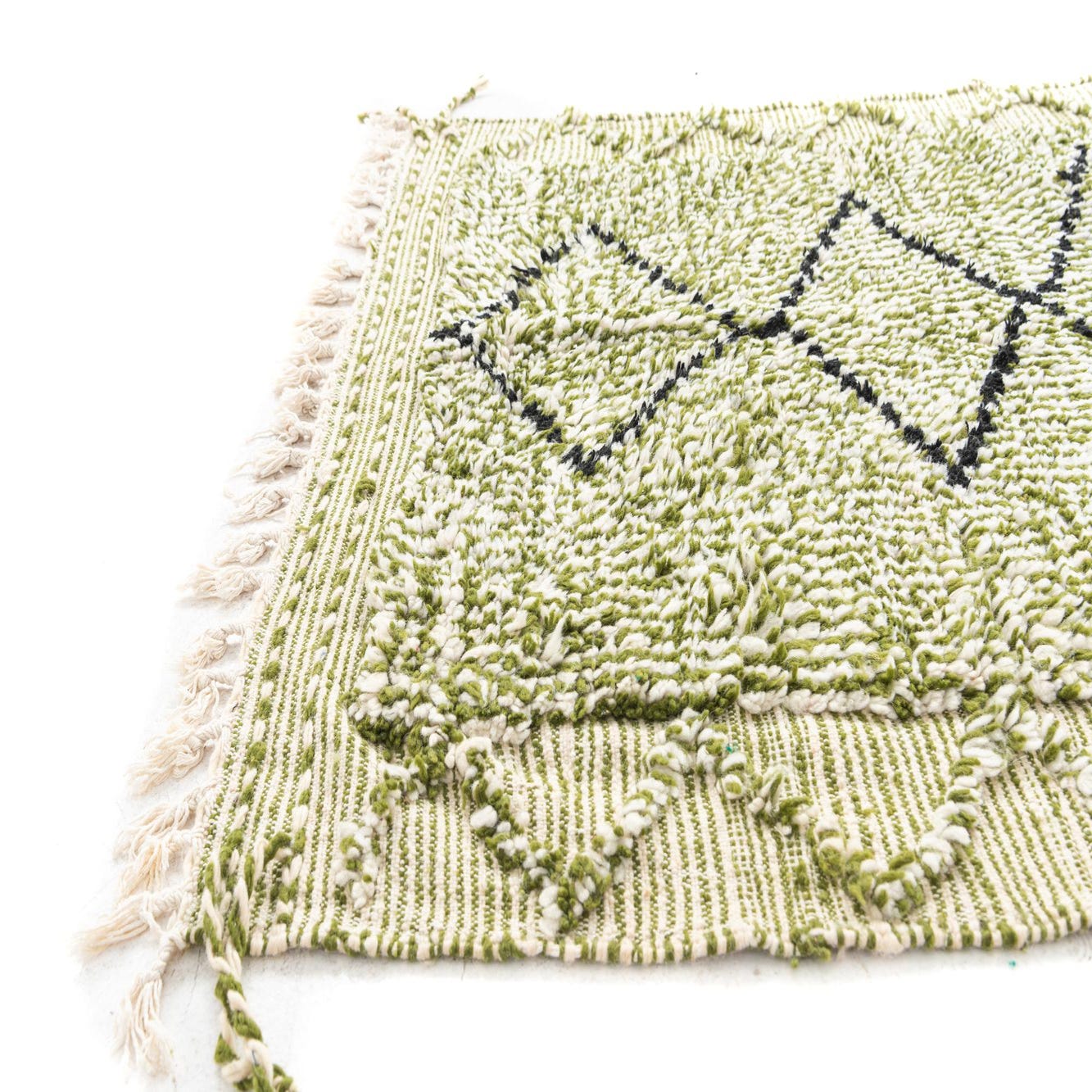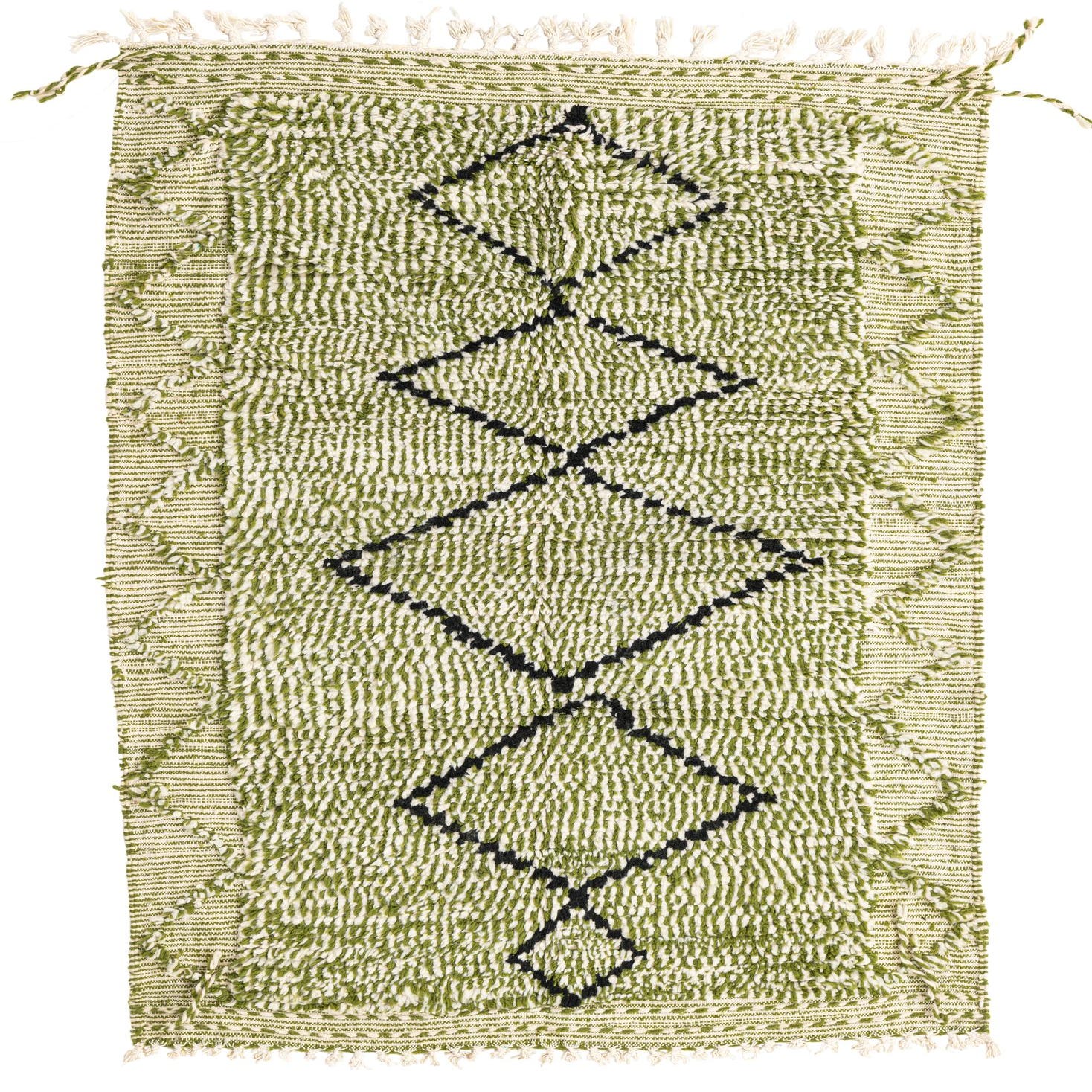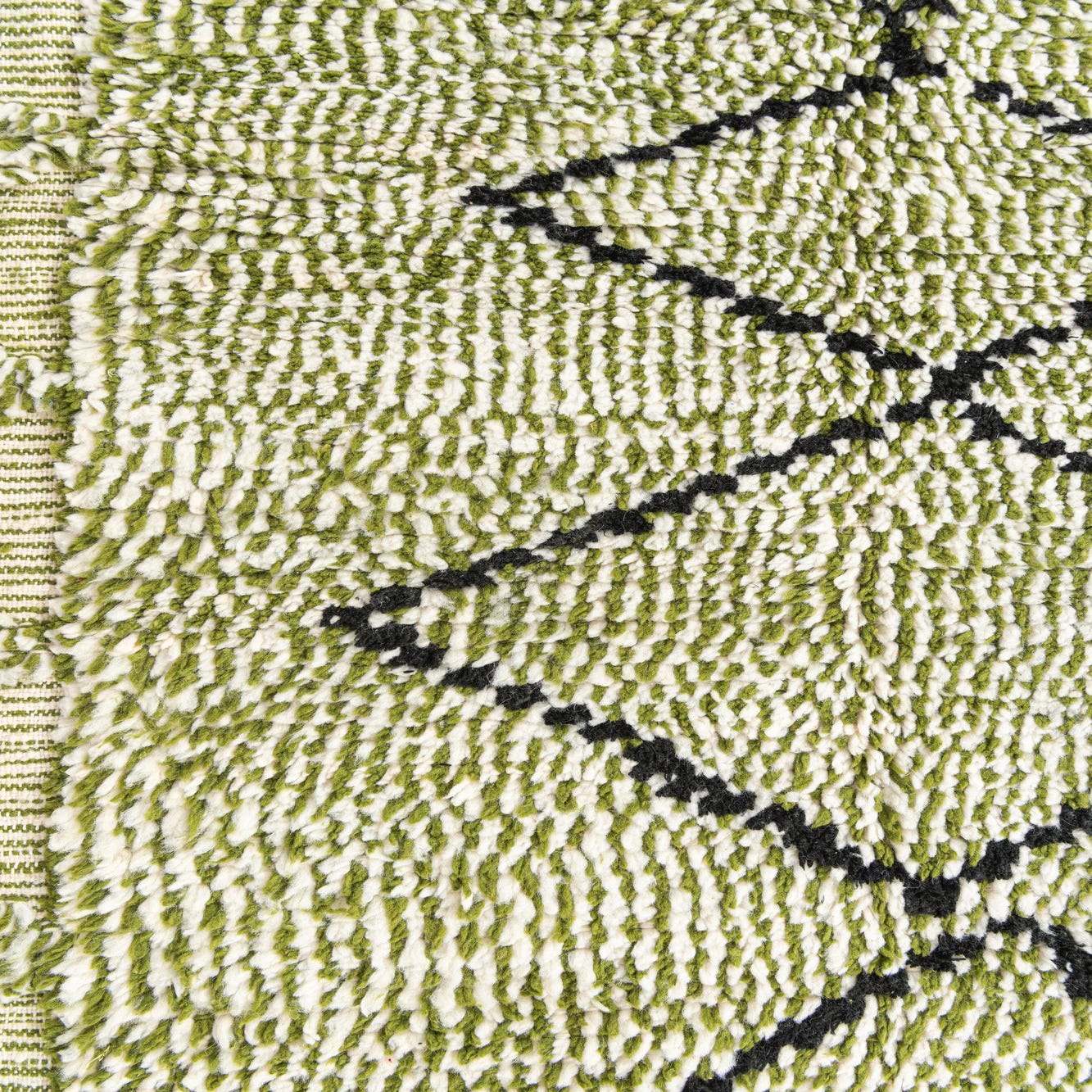 This Moroccan collection rug, sized 4x6 and hand-knotted of 100% wool, offers a distinctive and bold aesthetic to any interior space. The rug possesses a vibrant green background, decorated with traditional geometric motifs in contrasting black and nuanced with ivory accents. The texture of the rug is rich and tactile, indicative of its quality wool construction and handcrafted nature.