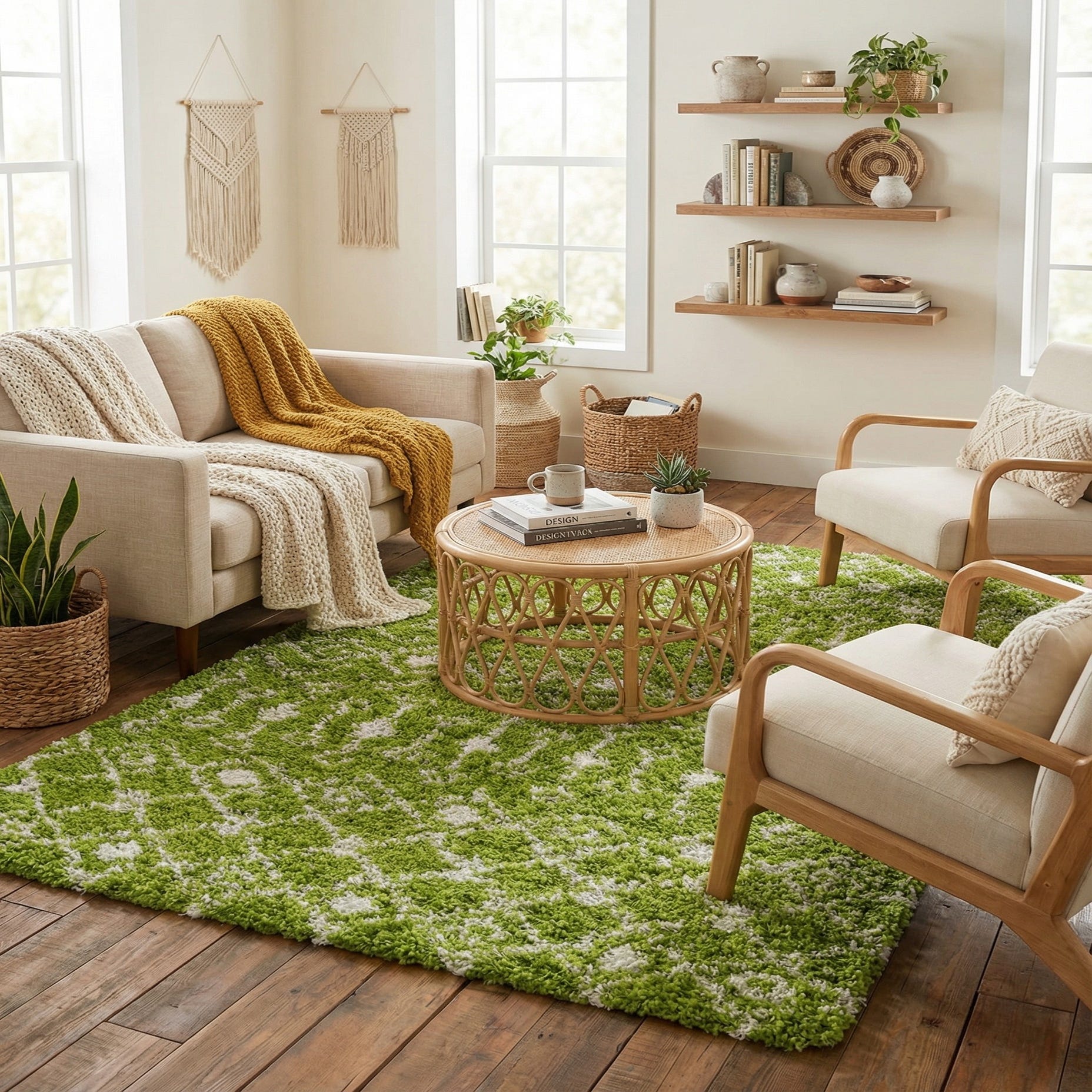 A 4x6 rectangular green and white shag rug with a modern tribal trellis pattern, ideal for a living room.