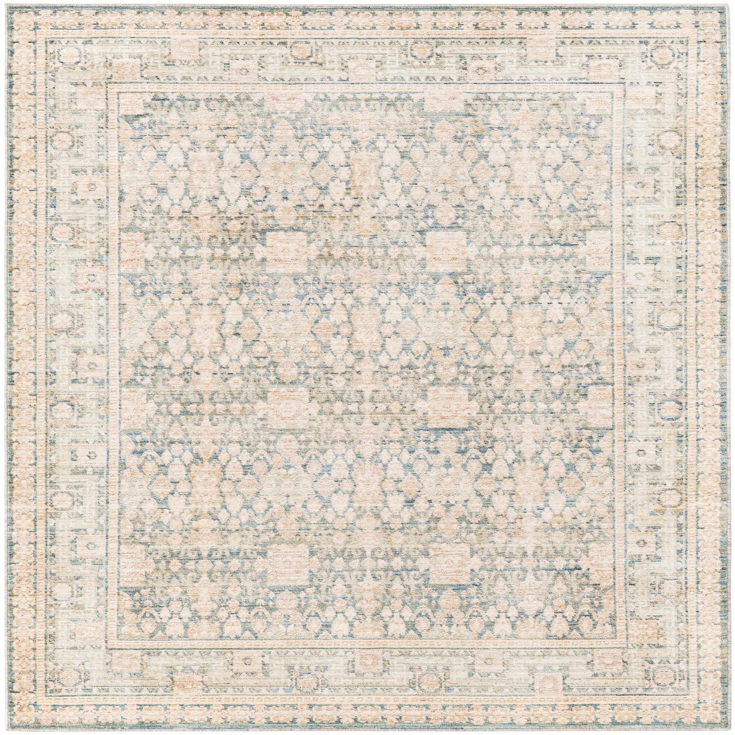 Primary color is Green. Colors in this rug include: Green, Beige, Ivory, Light Blue, Blue.