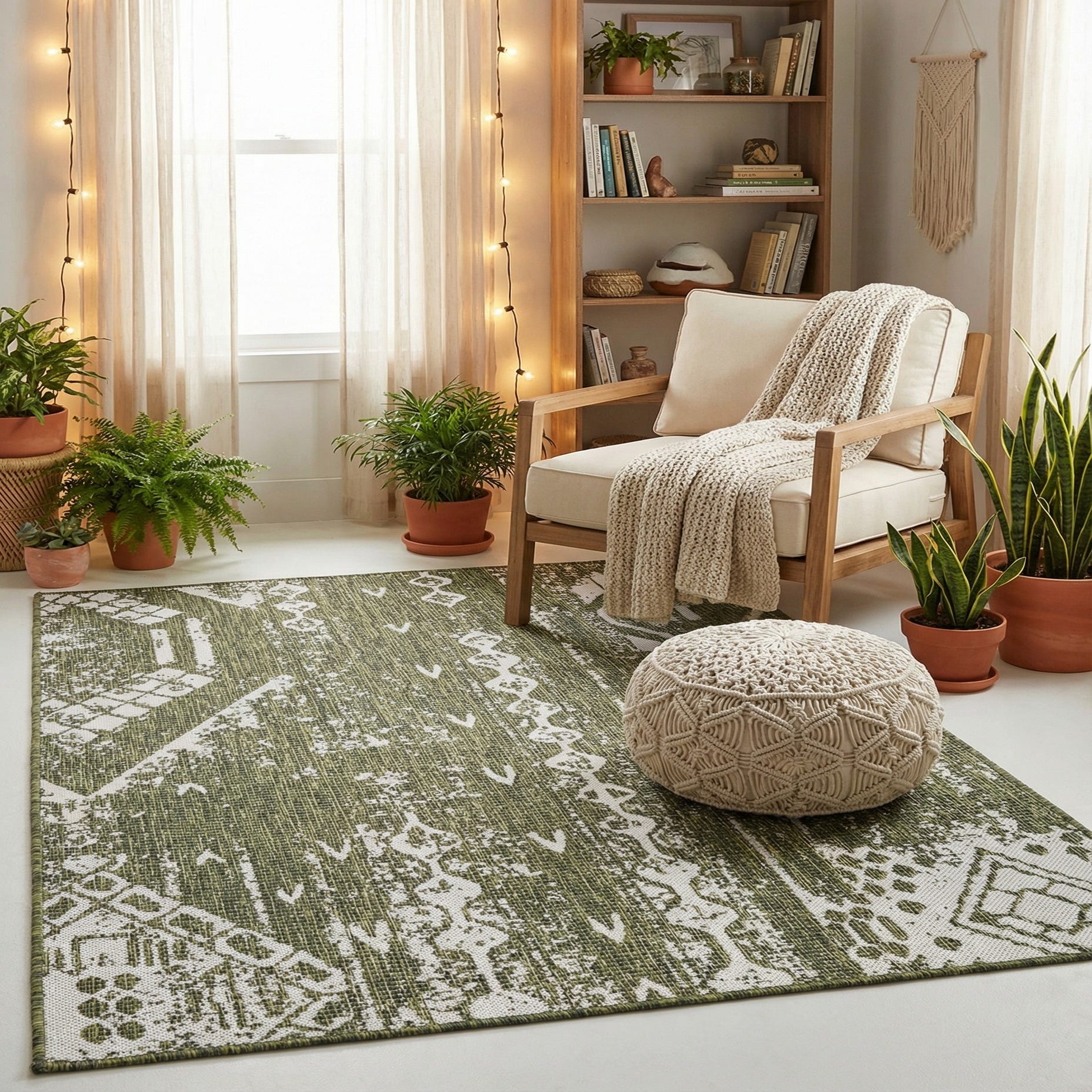 This Outdoor Bohemian collection rug offers a harmonious blend of green and ivory tones, manifested in a dynamic tribal pattern that captivates and adds visual interest to any space. The rug features a green background that provides a rich canvas for the ivory accents, creating an inviting balance of colors.