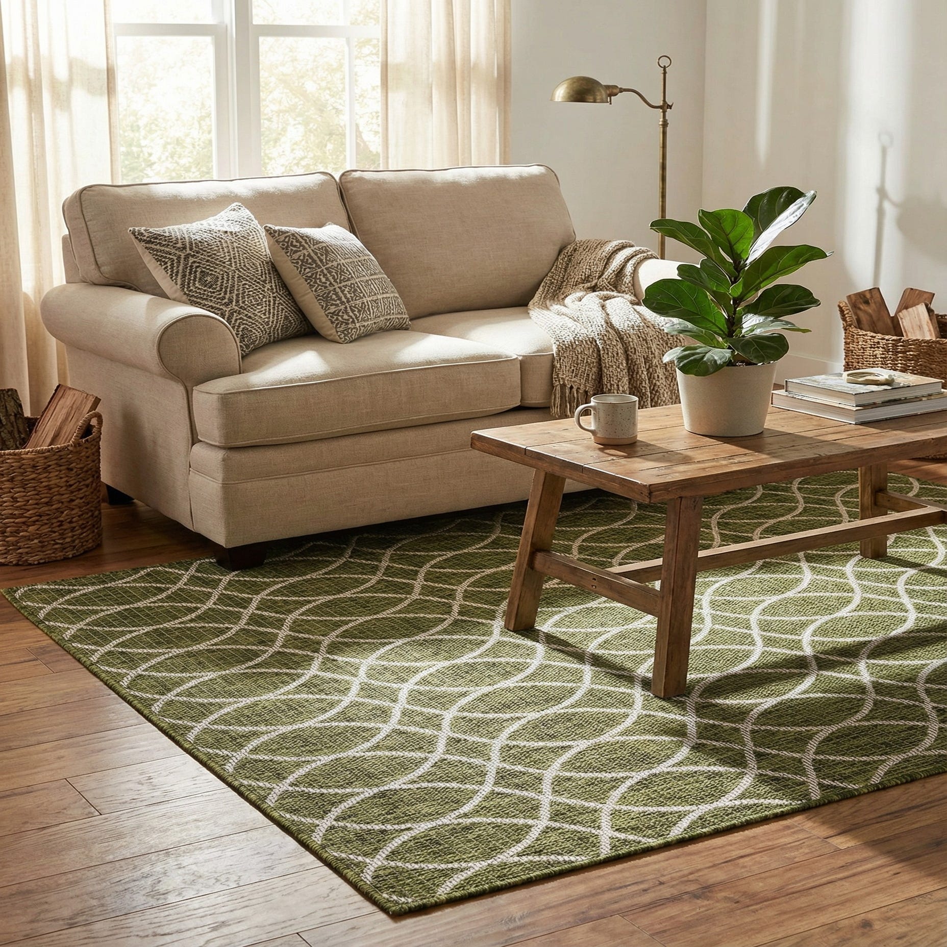 A 4x6 rectangular indoor/outdoor rug featuring a modern green trellis pattern with white interlocking circles.