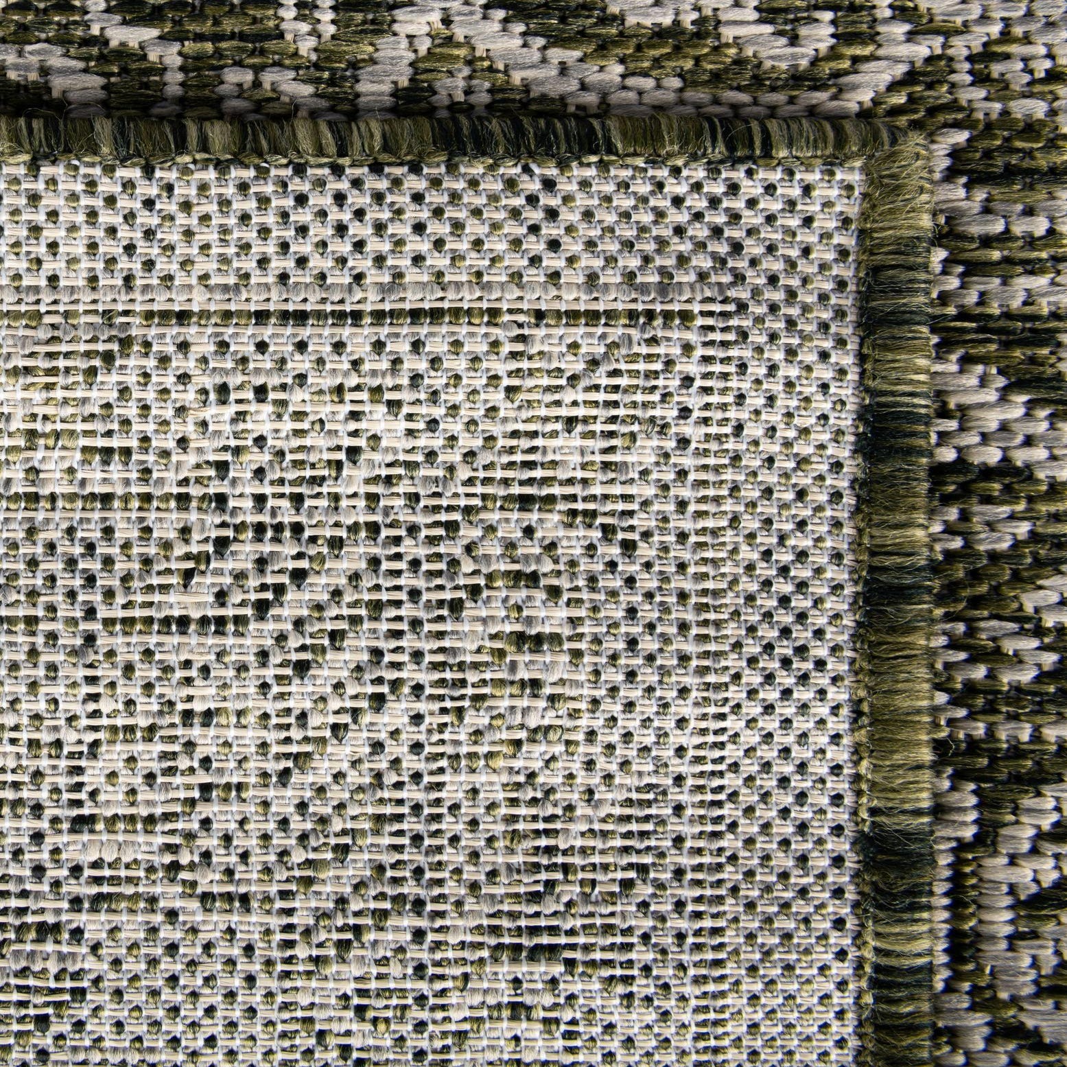 This piece works well in covered outdoor rooms and indoor transition zones where you want classic styling with practical performance. Pair it with wicker or teak seating for a relaxed porch, use it beneath a bistro set on a screened-in patio, or place it in an entry or kitchen to introduce pattern and color. It also complements traditional, transitional, and modern-farmhouse palettes—think warm woods, neutral grays, and soft linens to let the green and gray motif anchor the space.