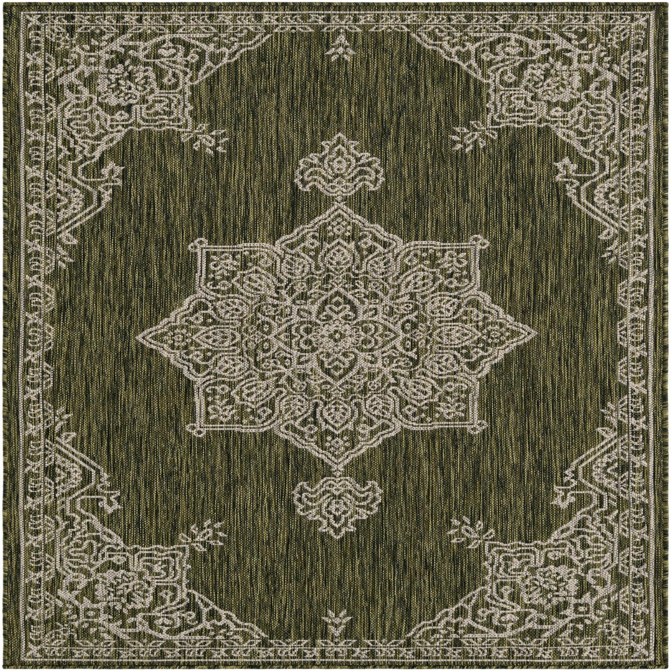 A 4x6 rectangular green indoor/outdoor rug with a light beige traditional medallion pattern and border.