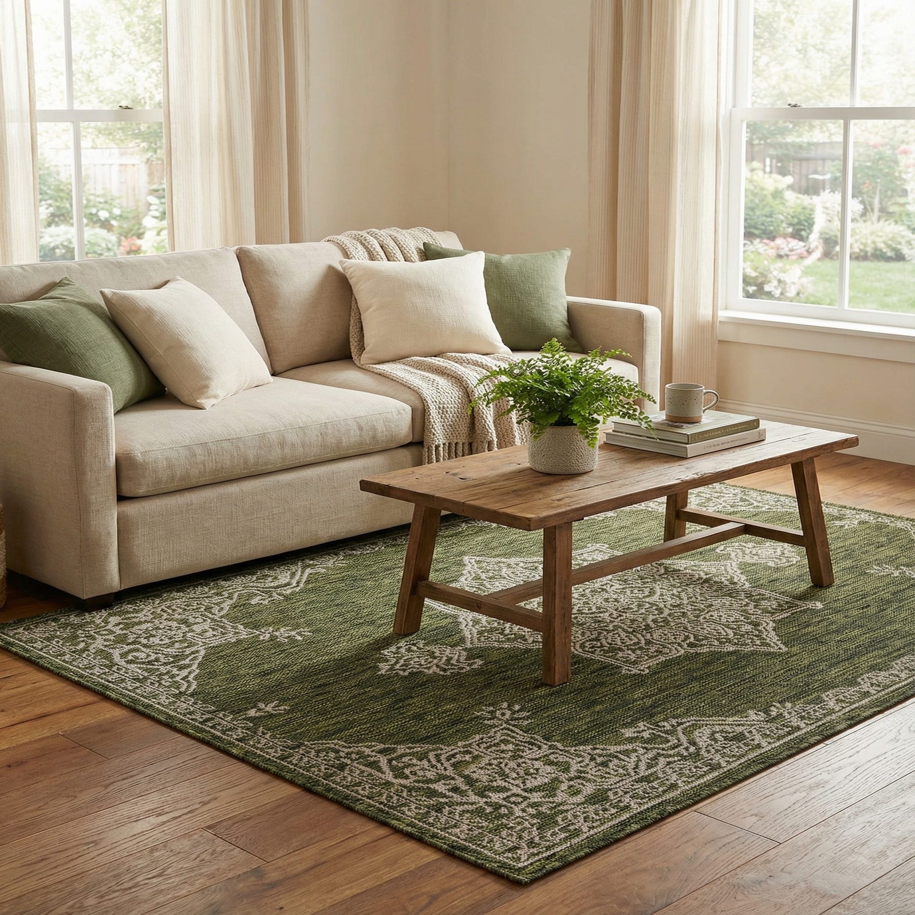 A 4x6 rectangular green indoor/outdoor rug with a light beige traditional medallion pattern and border.