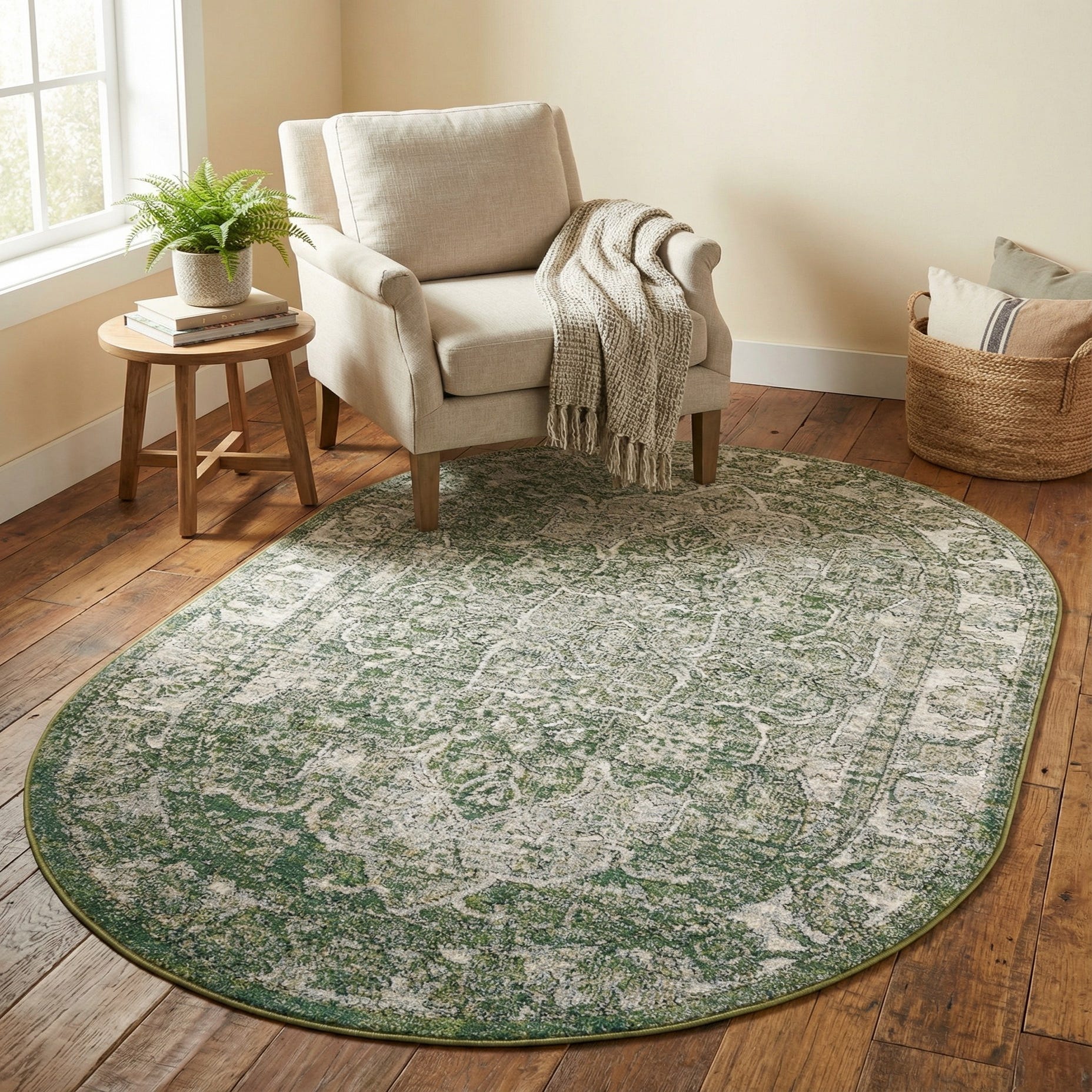 A softly distressed medallion design gives this oval rug a timeless, lived-in character. A green field sets the stage for an intricate central medallion and scrolling vine motifs worked in ivory, gray, black and touches of blue, creating layered color and subtle contrast. The border carries the same worn effect, so the pattern reads with gentle definition rather than sharp lines, bringing a relaxed, traditional-meets-modern presence to a room.