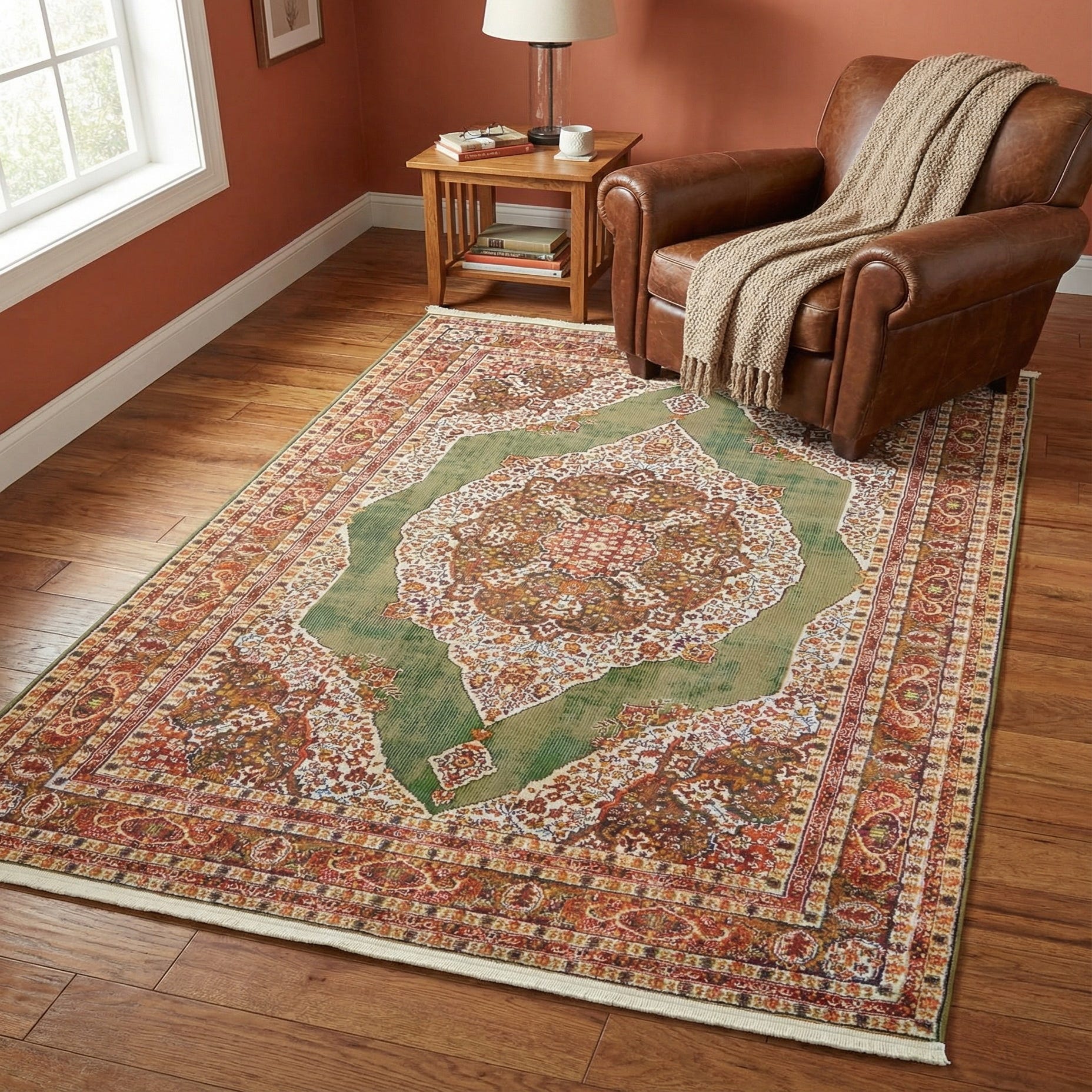 The Santiago Collection offers a 4x6, machine-woven rug crafted from 100% polypropylene fibers that cater to endurance and comfort underfoot. This rug showcases a rich palette including green, blue, ivory, olive, orange, red, and yellow with a green background that anchors its design. The intricate pattern presents traditional motifs that create a symmetrical arrangement, bordered by detailed stripes adding to its overall classic appeal.