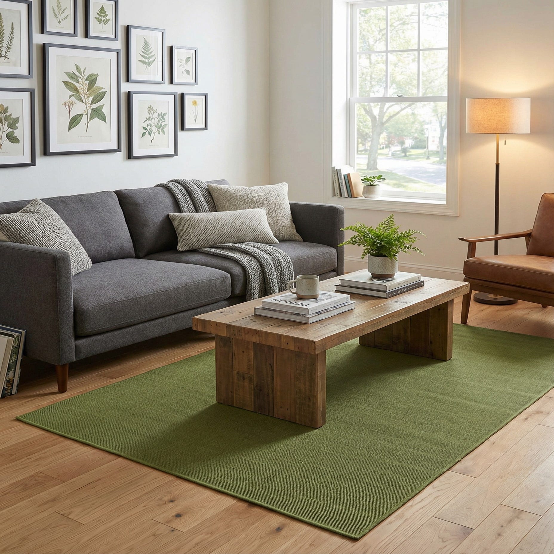 Pair it with light wood furniture and warm metals for a contemporary living area, or use it to anchor a bedroom layered with linens and soft throws for a relaxed, cohesive look. It also works well under a simple dining table or in an entry where a calm, unified color field supports bolder accessories—think patterned pillows, woven baskets, or leafy houseplants to complement the green tone.