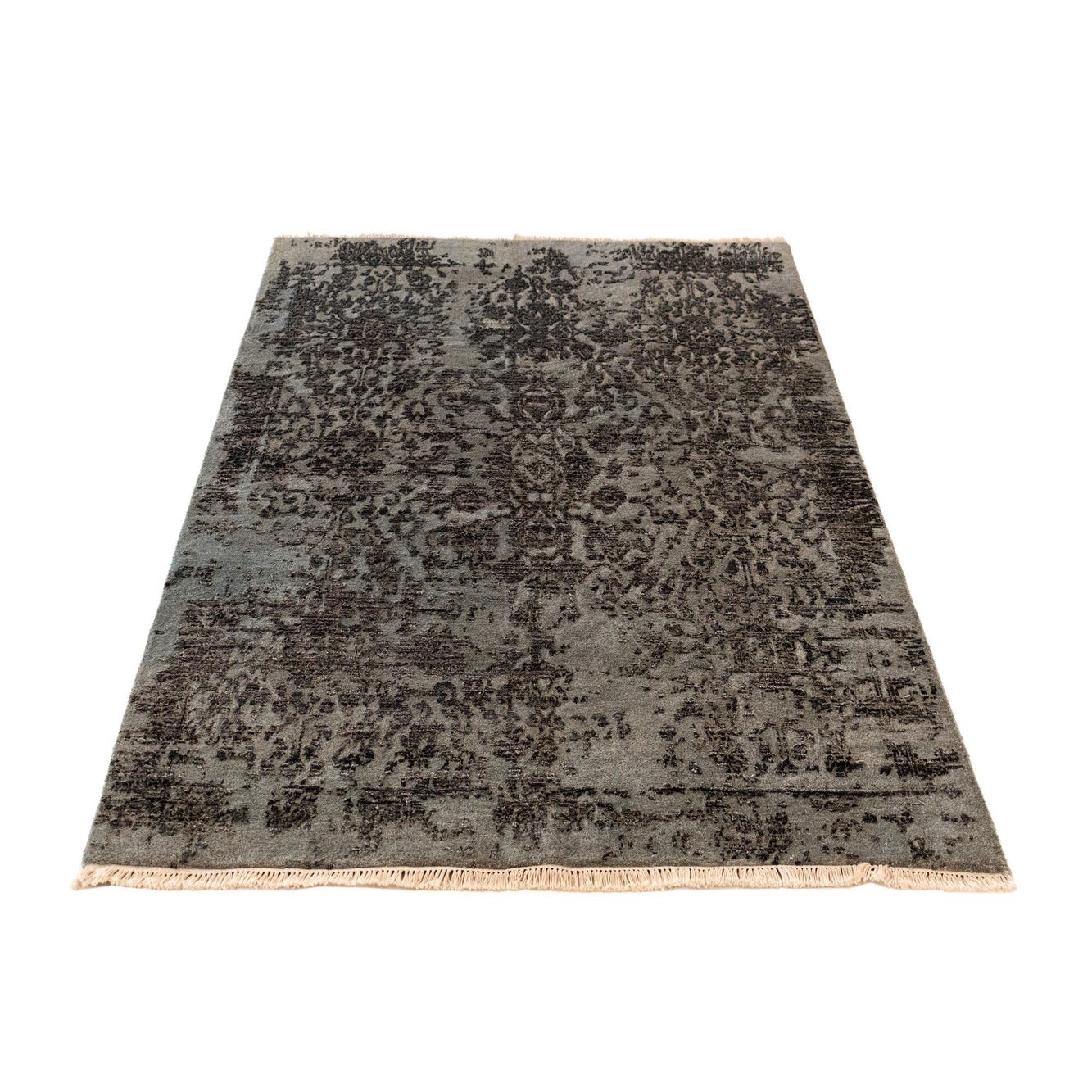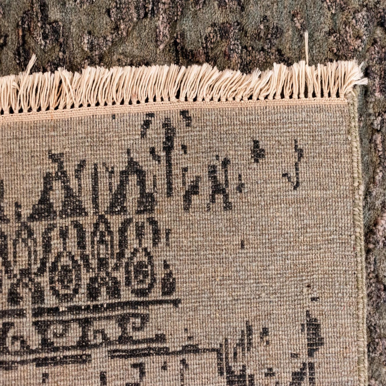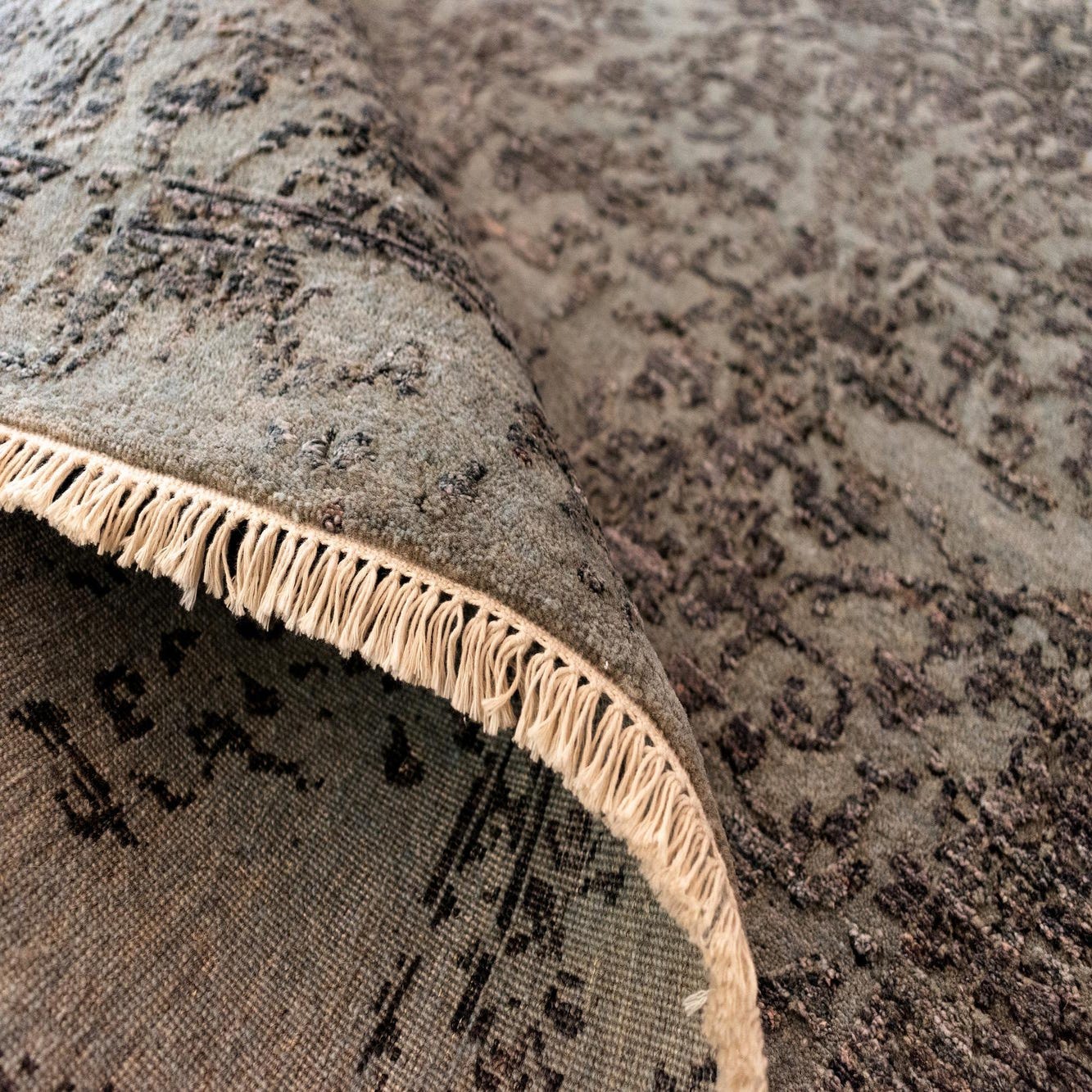 A quietly distressed, vintage-inspired pattern sits on a muted green ground, where charcoal and warm taupe accents form an aged medallion and softened floral motifs. The hand-made, 100% wool construction creates a dense, warm surface with gentle pile variation that you can feel beneath your feet; areas of slightly lower pile highlight the worn detailing and give the rug a lived-in, layered look. Short, natural fringe trims the ends for a subtle finishing touch.
