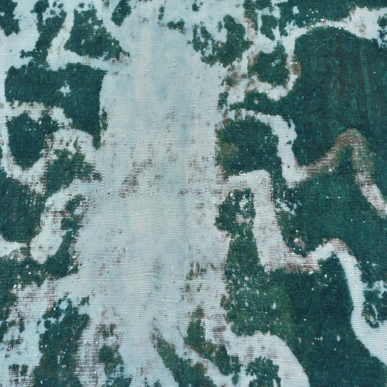A 4x6 rectangular green wool rug with an abstract, distressed vintage Persian pattern, ideal for a living room.