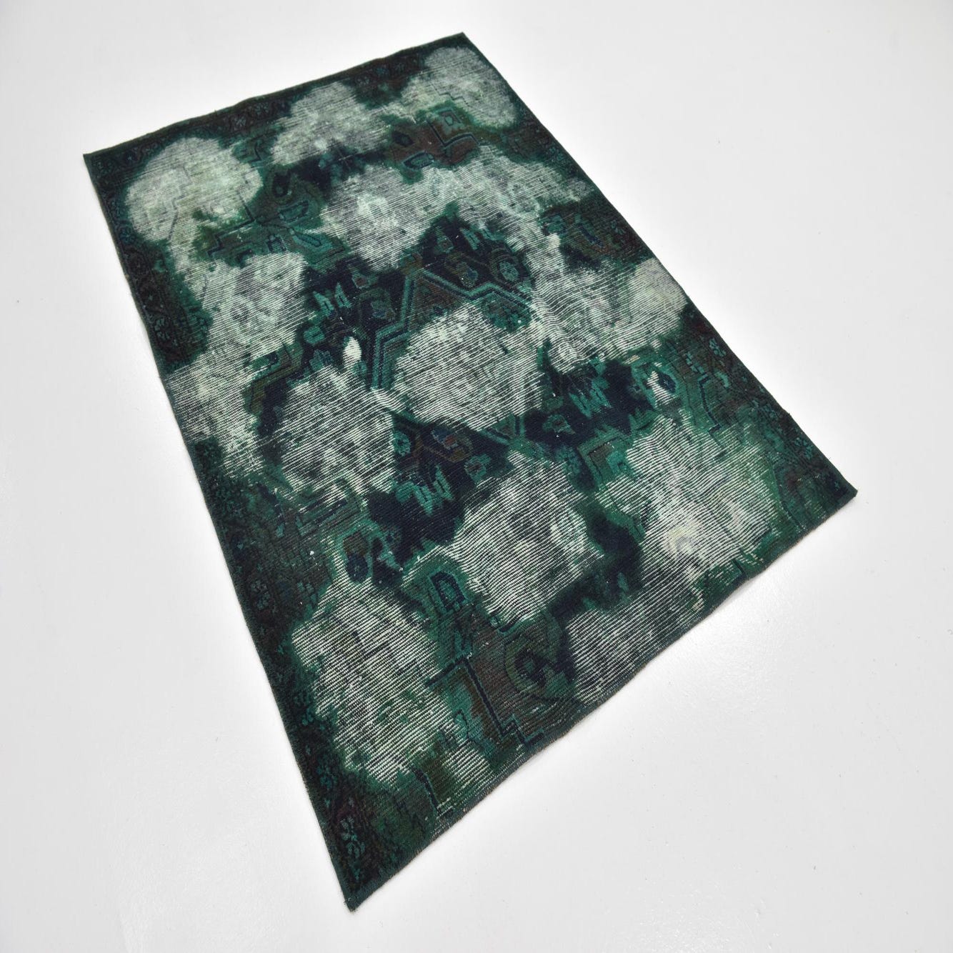 A 4x6 rectangular Ultra Vintage wool rug featuring a distressed Persian pattern in shades of green, black, and white.
