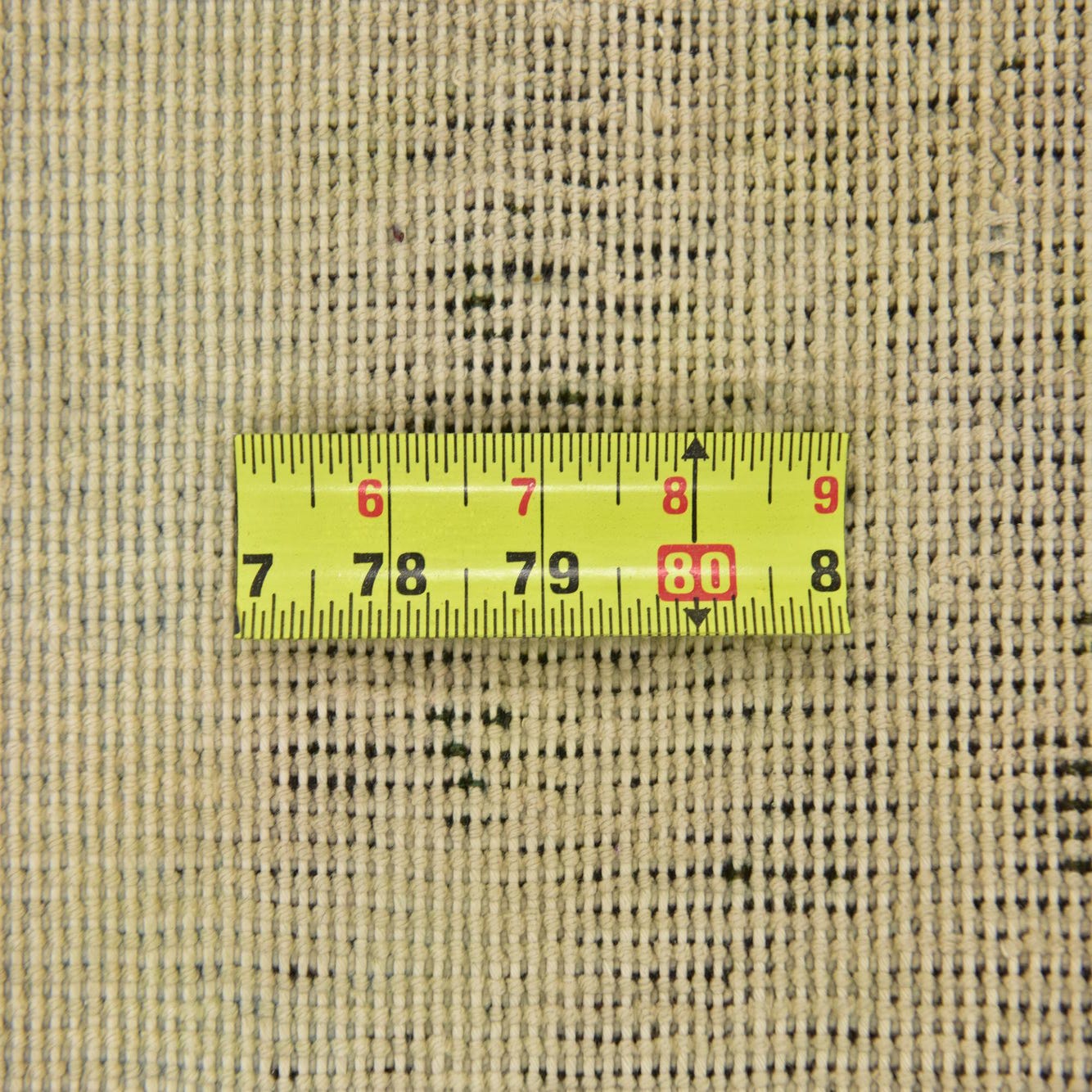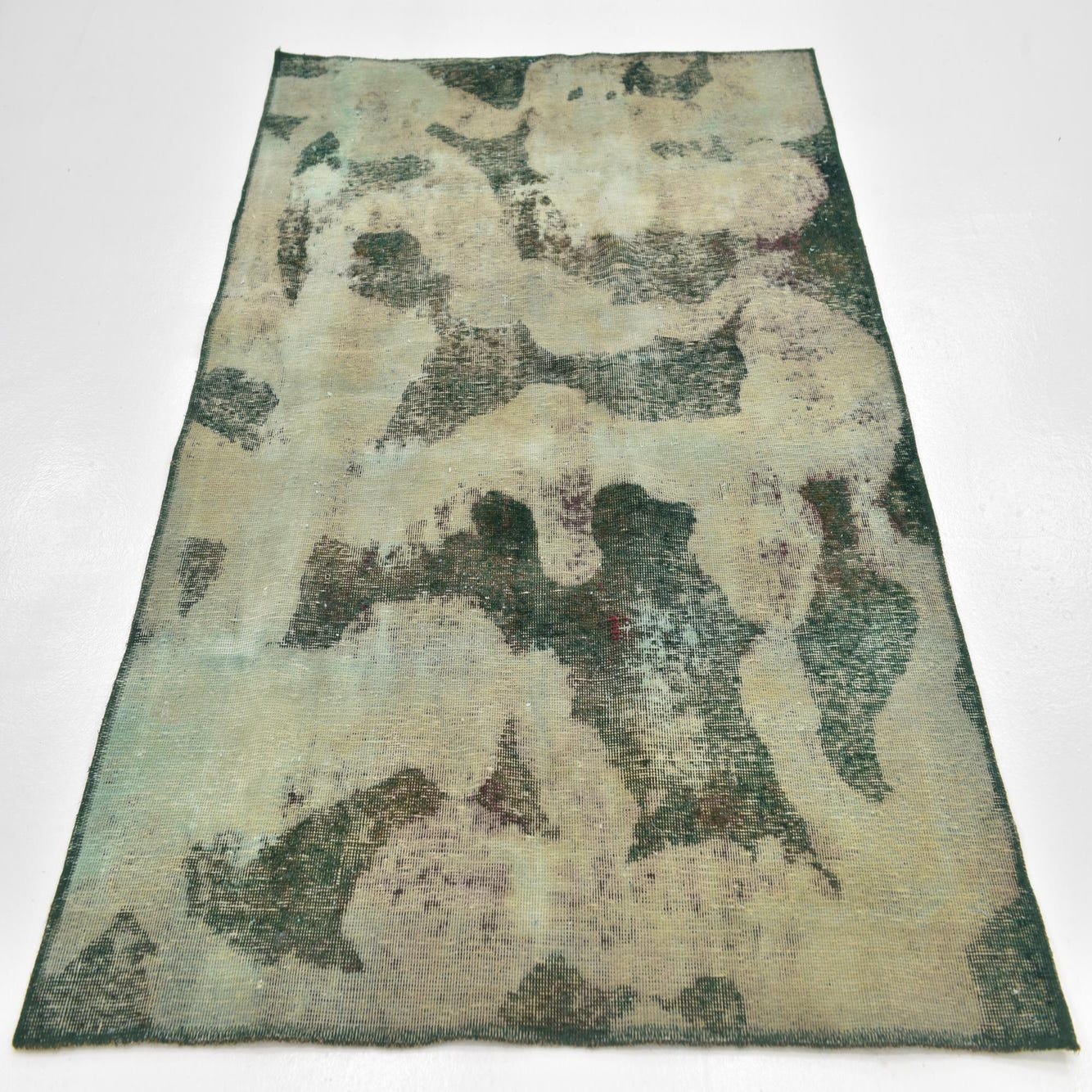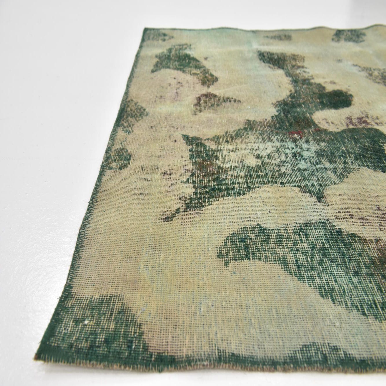 A 4x6 rectangular green and off-white abstract wool rug with a distressed vintage look.