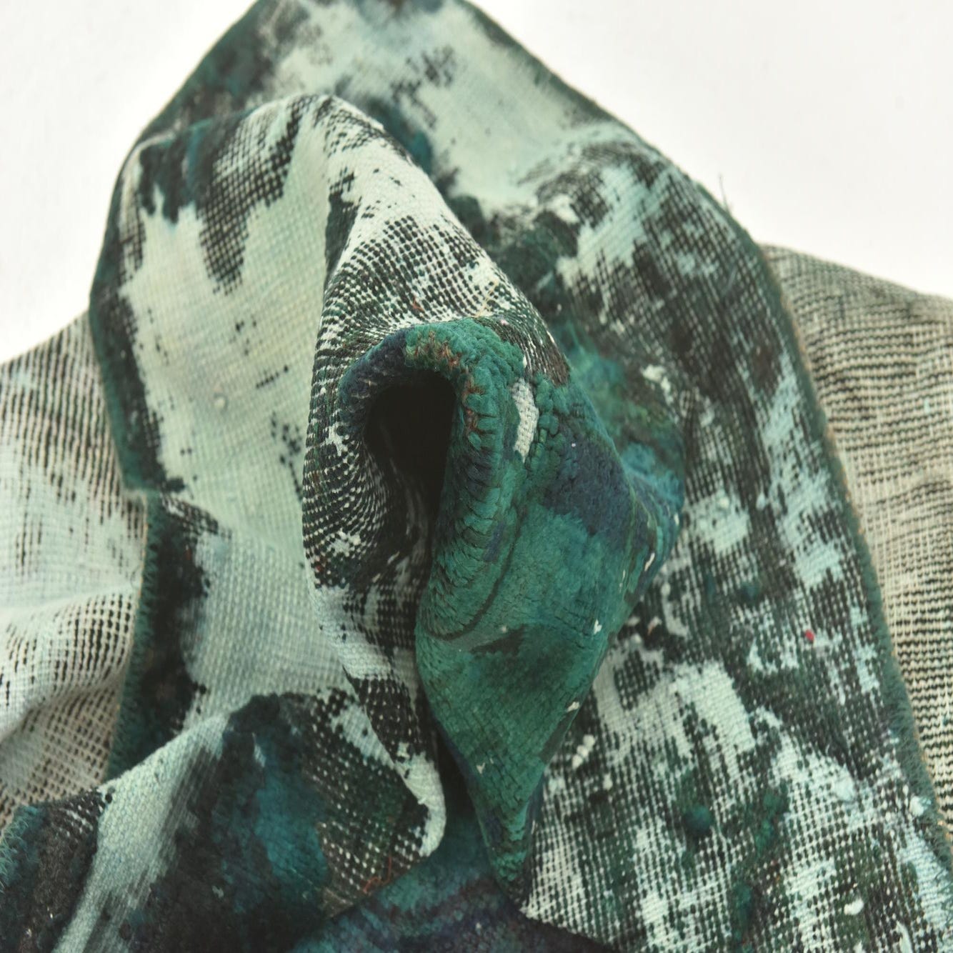 Part of the Ultra Vintage collection, this 4x6 hand-knotted rug is a testament to craftsmanship and time-honored design, made entirely of 100% wool. The rug displays a distinguished pattern that oscillates between traditional motifs and a distressed aesthetic, creating a sense of history and contemporary chic. A rich palette consisting of green, ivory, navy blue, olive, and teal hues blend harmoniously against the primary green background, offering depth and versatility.