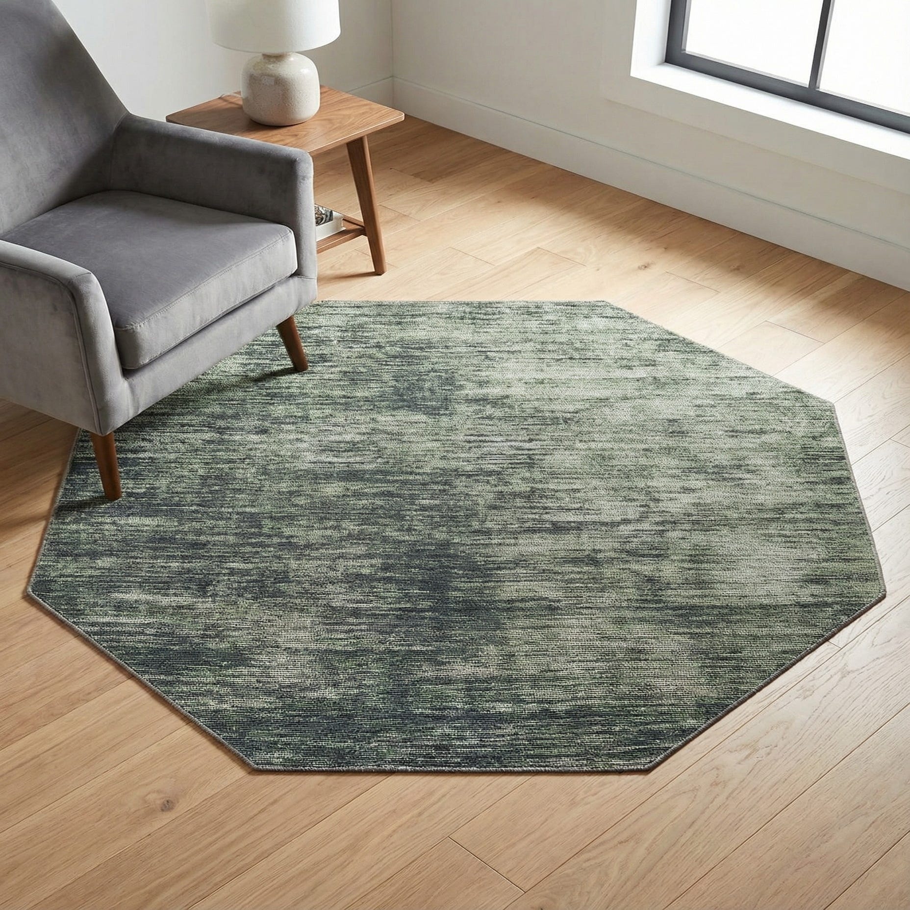The octagon silhouette works well as an anchor in smaller seating areas, beneath a round or octagonal coffee table, or centered in an entryway for a refined first impression. It pairs naturally with warm wood tones, neutral linens, and mixed-metal accents in contemporary, transitional, Scandinavian, or mid-century inspired interiors, bringing subtle pattern and soft texture without overpowering the room.