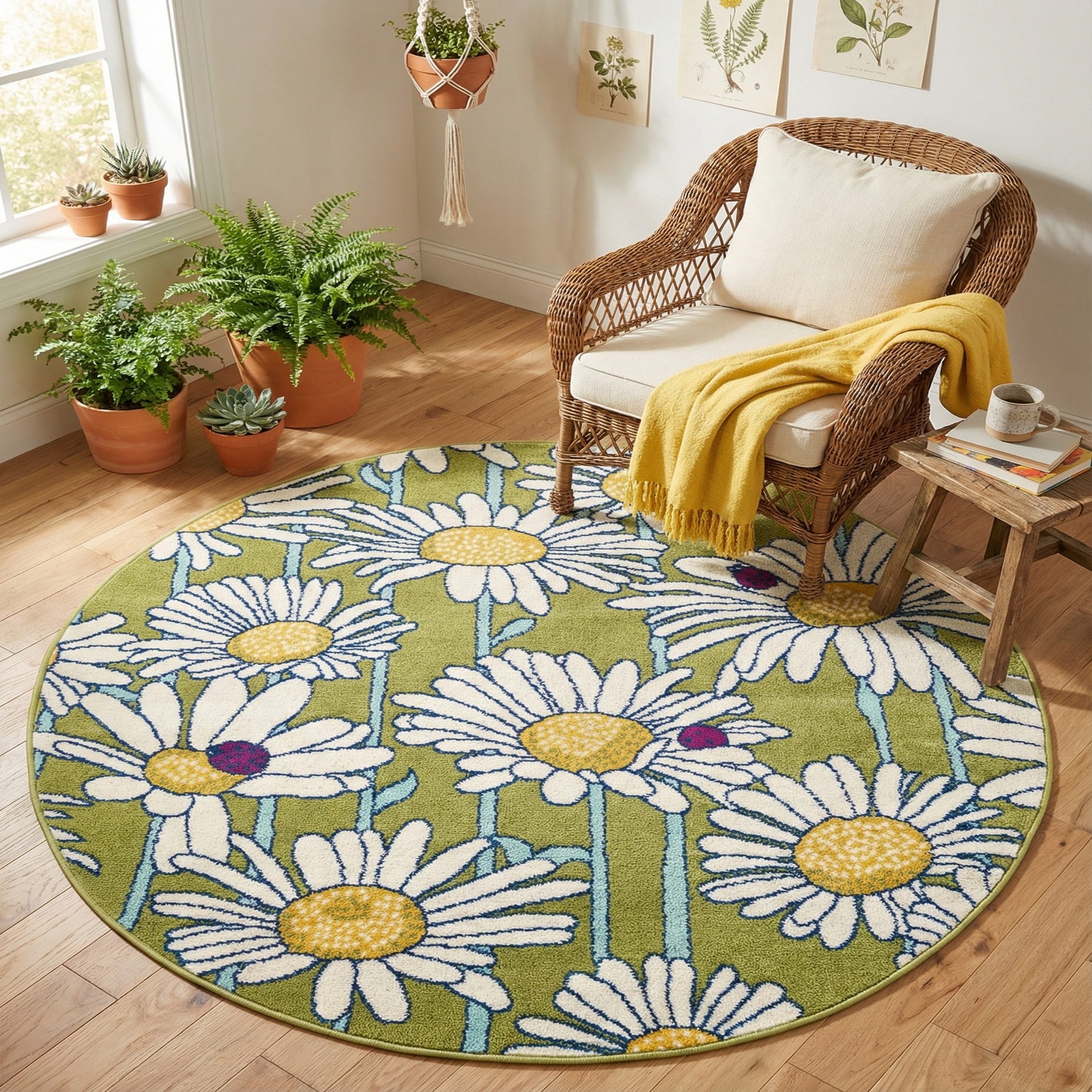 A round floral rug patterned with oversized daisy motifs across a green field brings a cheerful, modern botanical feel to the floor. Ivory petals and sunny yellow centers sit against the green background while light-blue stems and navy-blue outlining define each blossom; small purple accents provide playful contrast. Machine-made from 100% polypropylene, the surface has a soft, low-profile pile with tight tufting that gives the flowers clean edges and a subtle tactile dimension underfoot.