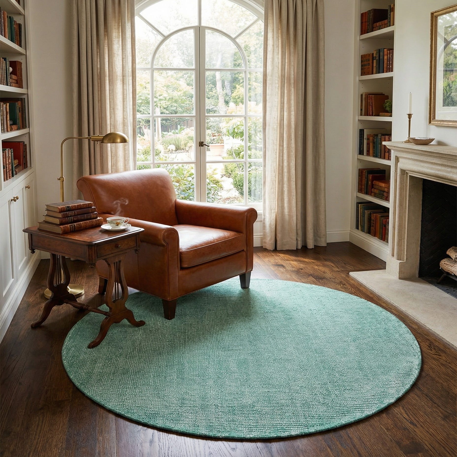 This rug pairs well with light or medium wood tones, linen upholstery, and warm metal accents for a relaxed, lived-in feel. Use it to anchor an intimate seating area, define a reading nook, or add a fresh note to a home office or sunroom. It also layers nicely beneath a round table to create a cozy dining spot or beneath a chair to introduce color and texture to an entry or bedroom corner.