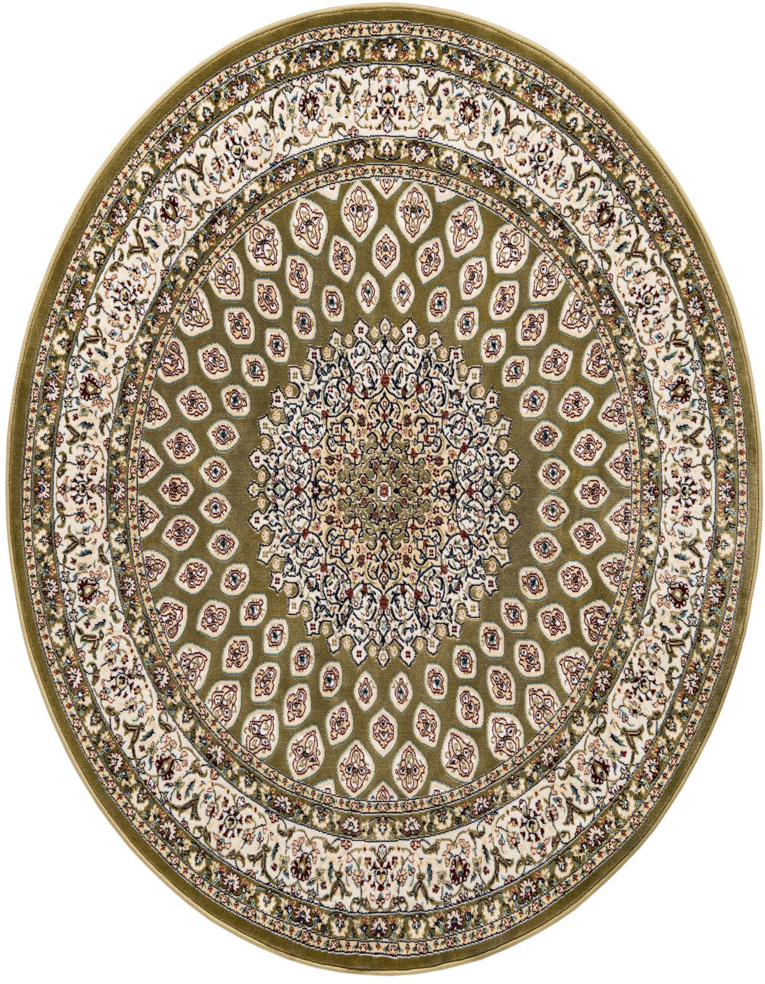 A traditional round medallion rug with a layered, Persian-inspired layout — a finely detailed central medallion blooms from a green field, surrounded by concentric rows of teardrop and floral motifs. The wide border in cream and ivory frames the design with scrolling vines and small floral accents, while navy blue, blue, puce, beige and burgundy highlights add depth to the pattern. Run your hand across the surface and you’ll notice a tight, low pile that presents the intricate motifs cleanly and gives the rug a smooth, slightly cushioned feel.
