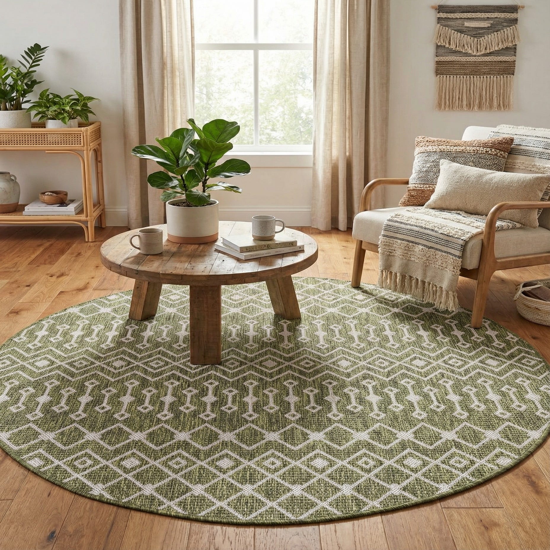 This piece works well on a covered patio or sunroom to define a seating area, beneath a round bistro table, or as an anchor for a cosy conversation nook. The green-and-gray palette pairs naturally with warm wood tones, rattan or wicker furniture, and neutral linens—suiting modern coastal, mid-century, and relaxed transitional interiors. Add potted plants and light textiles to reinforce a layered, inviting look.