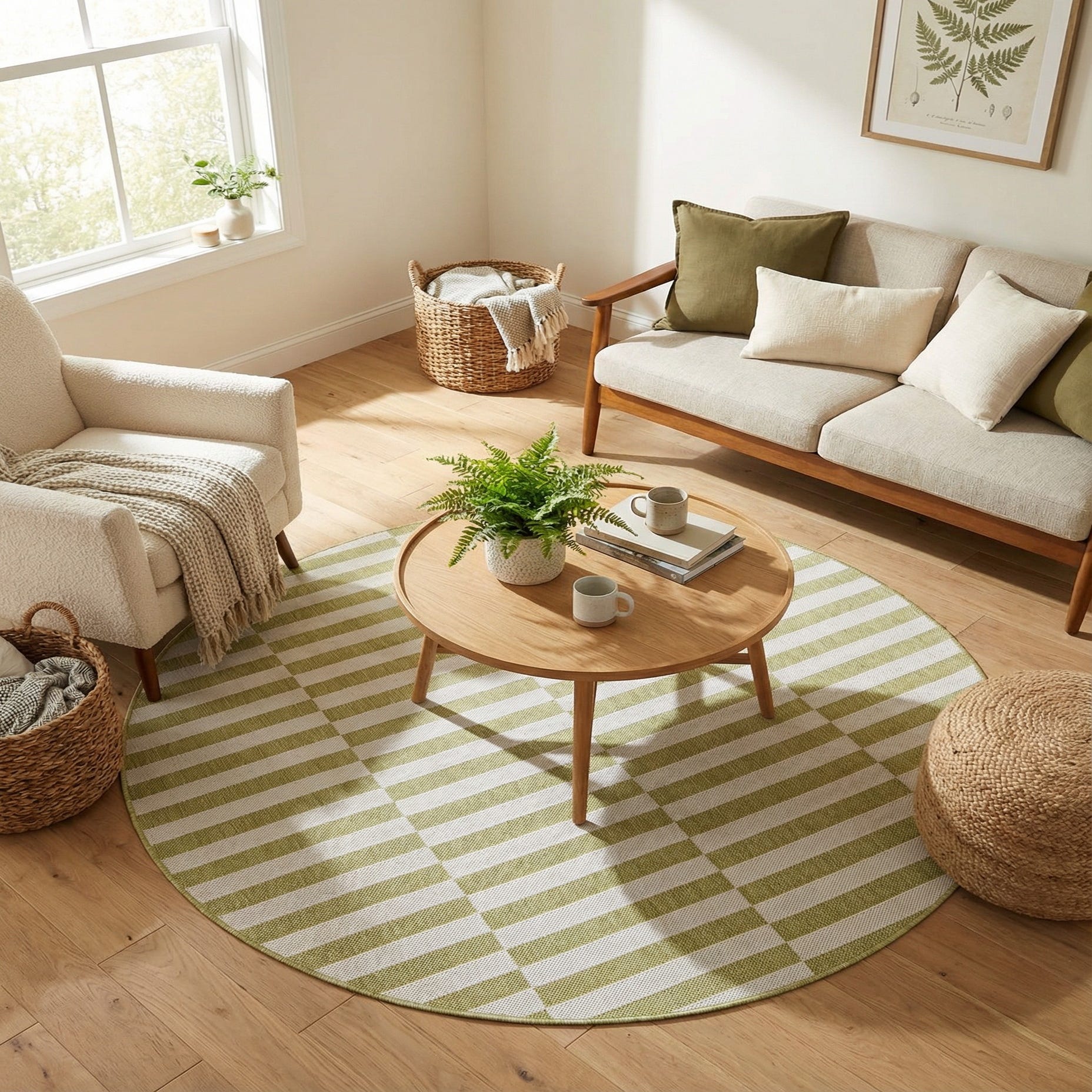 A clean, geometric ribbon pattern alternates crisp ivory bands with textured green fields across a round shape, creating a rhythmic, checkerboard-like effect. The green background reads as a soft, grassy tone while the ivory stripes provide contrast and structure. Machine-made from 100% polypropylene, the rug has a low-profile, tightly woven surface that feels smooth with a subtle ribbed texture from the weave.