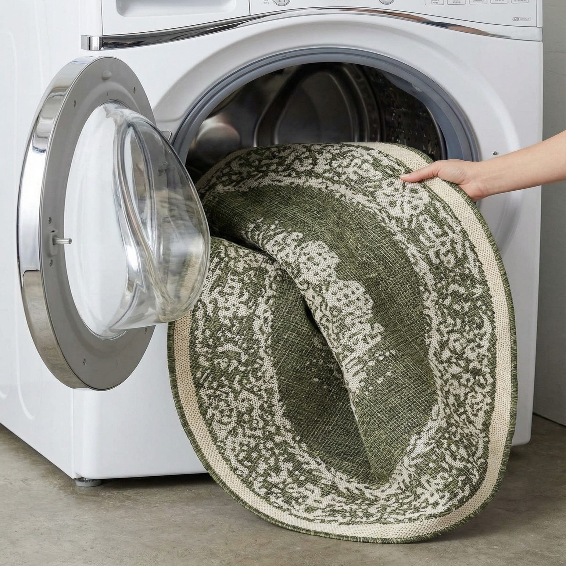 This round rug works well on covered porches and patios, under a small outdoor dining set, or layered in a sunroom to bring a grounded, traditional touch to casual spaces. It pairs nicely with wicker or painted wood furniture in neutral or natural finishes, and complements classic or transitional decor schemes—think farmhouse bistro, coastal-cottage accents, or a laid-back garden seating area.
