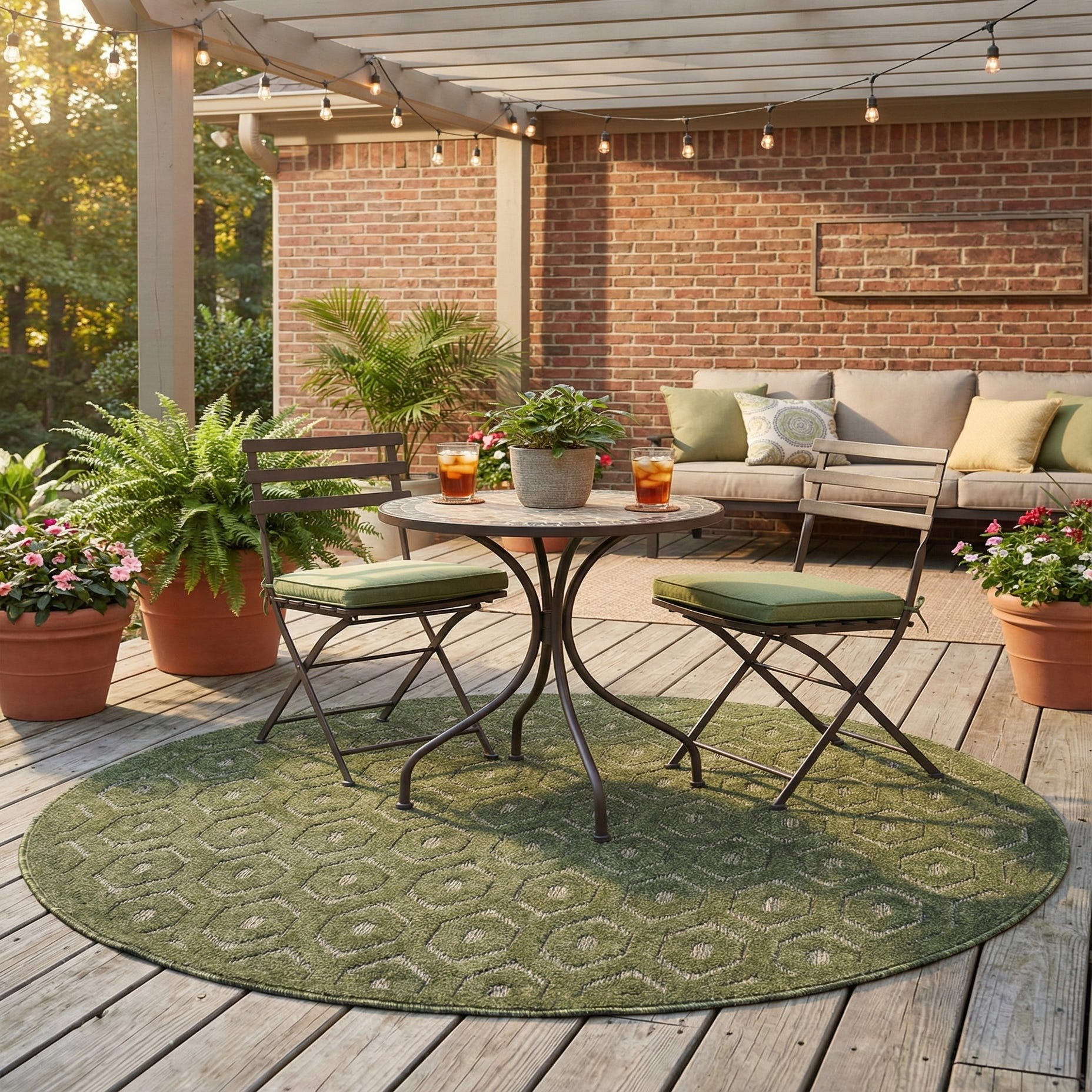 A round green indoor/outdoor rug with a textured modern geometric pattern, ideal for a patio or living space.