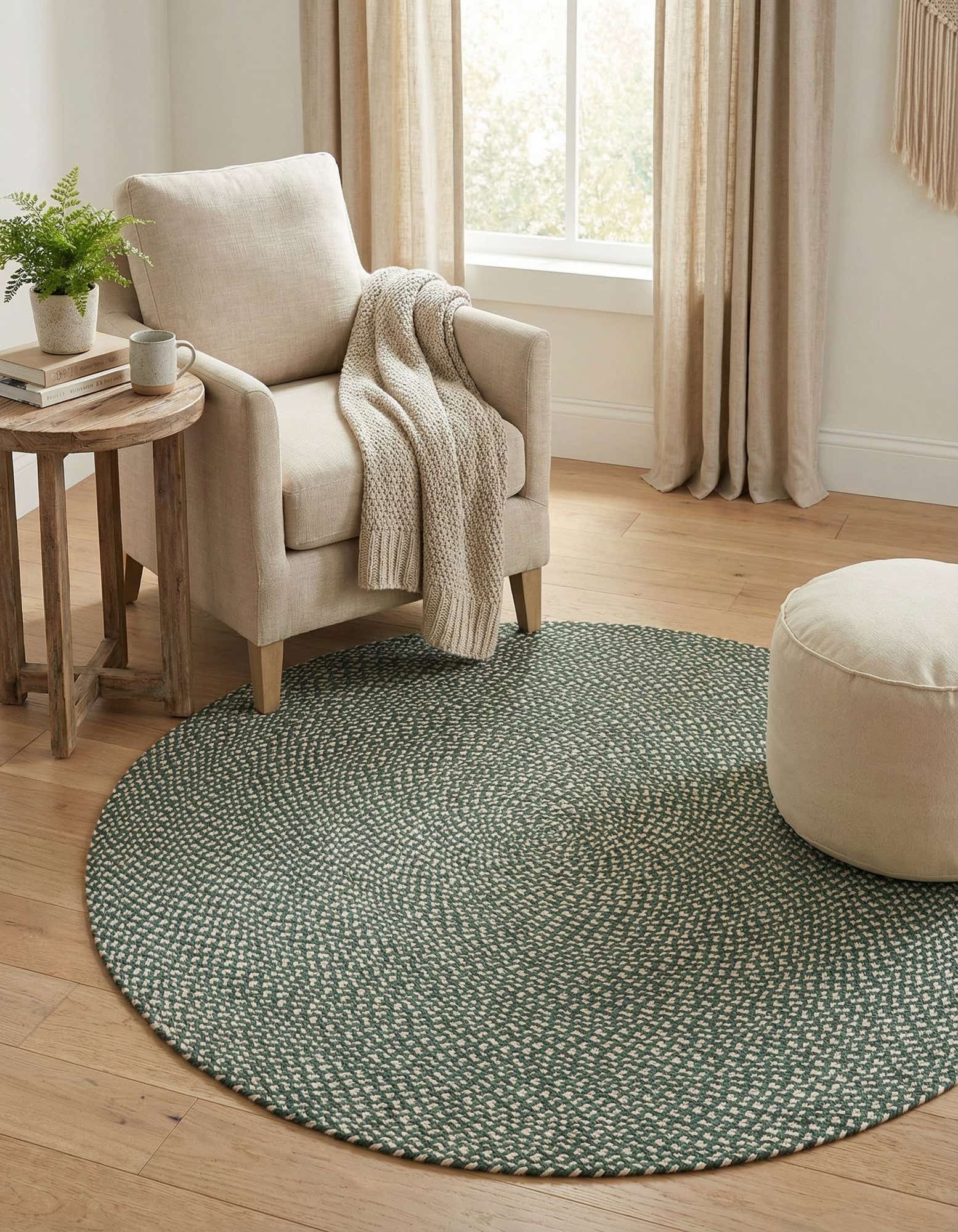 Hand-braided from 100% jute, this round rug presents a tight, concentric braided pattern in a green ground interwoven with ivory strands for a soft, heathered effect. The braided coils create a low-profile, slightly nubby surface that feels sturdy and natural underfoot, offering subtle visual movement without high pile. The two-tone weave brings depth to the green background while the ivory highlights add contrast and texture.
