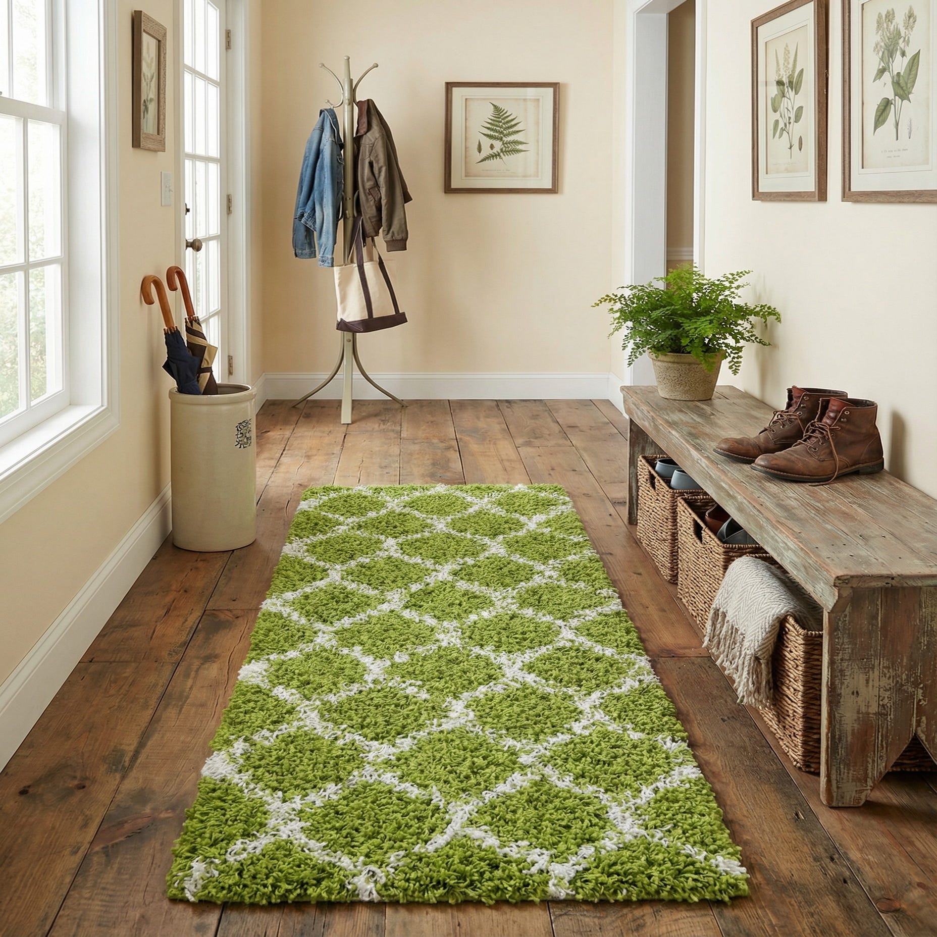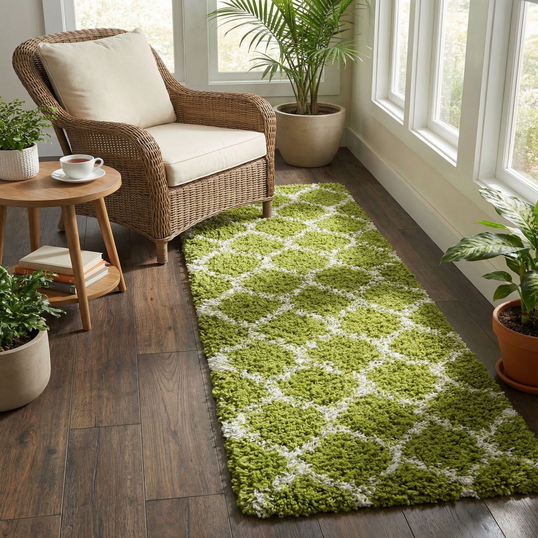 A lively green ground is crossed by an ivory lattice of interlocking diamonds, creating a modern trellis pattern that runs the length of the runner. The shag pile is thick and plush, with tousled polypropylene strands that create a soft, cushioned surface and a tactile, slightly rustic texture where the ivory lines thread through the green field. Machine-made from 100% polypropylene, the construction delivers consistent pile and a finished edge for a neat, uniform look.
