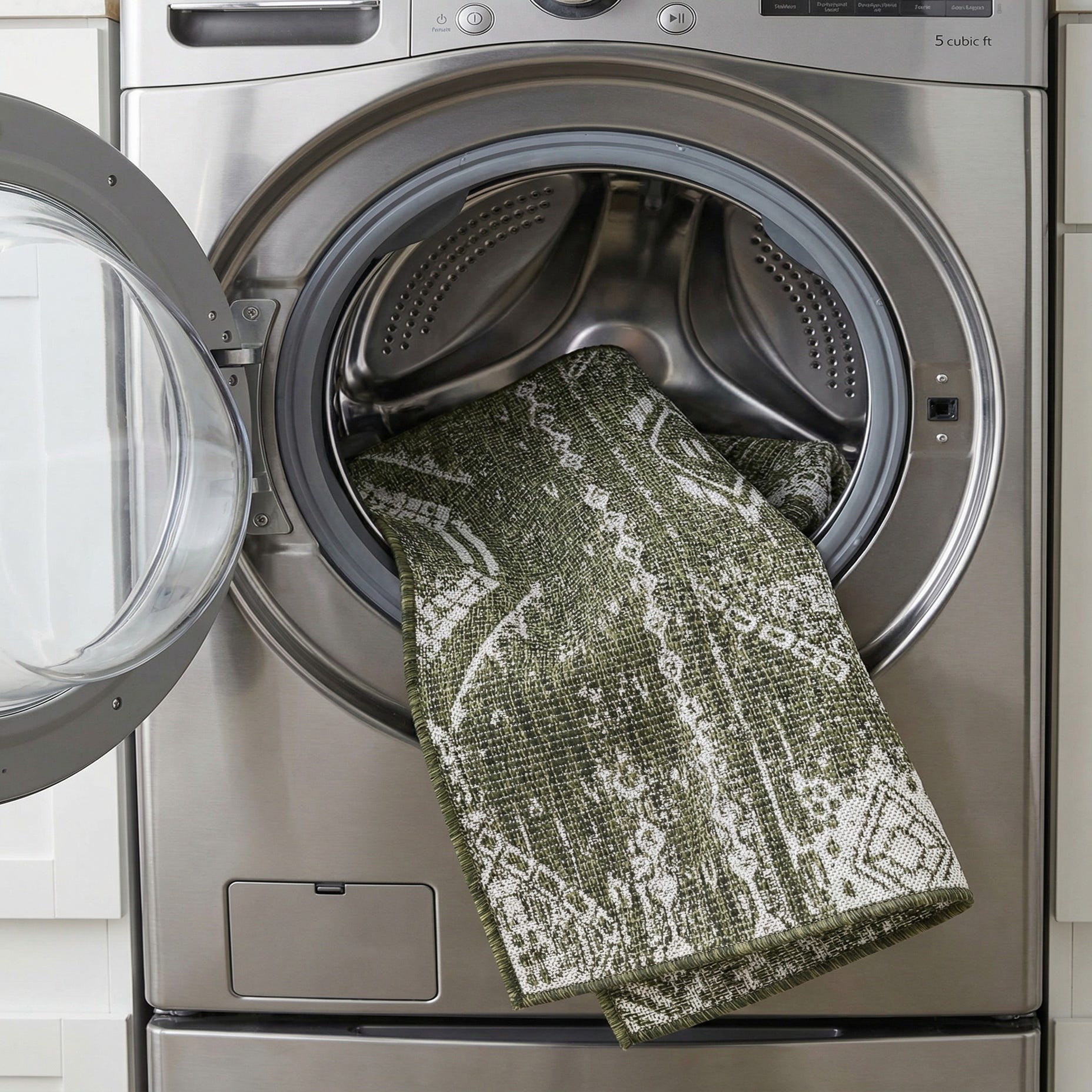 Its stain-resistant property ensures longevity and resilience to the elements, while the pet-friendly and shed-free characteristics render it a practical choice for homes with pets or high foot traffic areas. The green and ivory color scheme can effortlessly complement natural outdoor spaces, such as patios and decks. Inside the home, this runner could serve as a sophisticated corridor feature or as an understated yet stylish addition to kitchens, entryways, or laundry rooms, merging well with neutral or earth-toned decor.