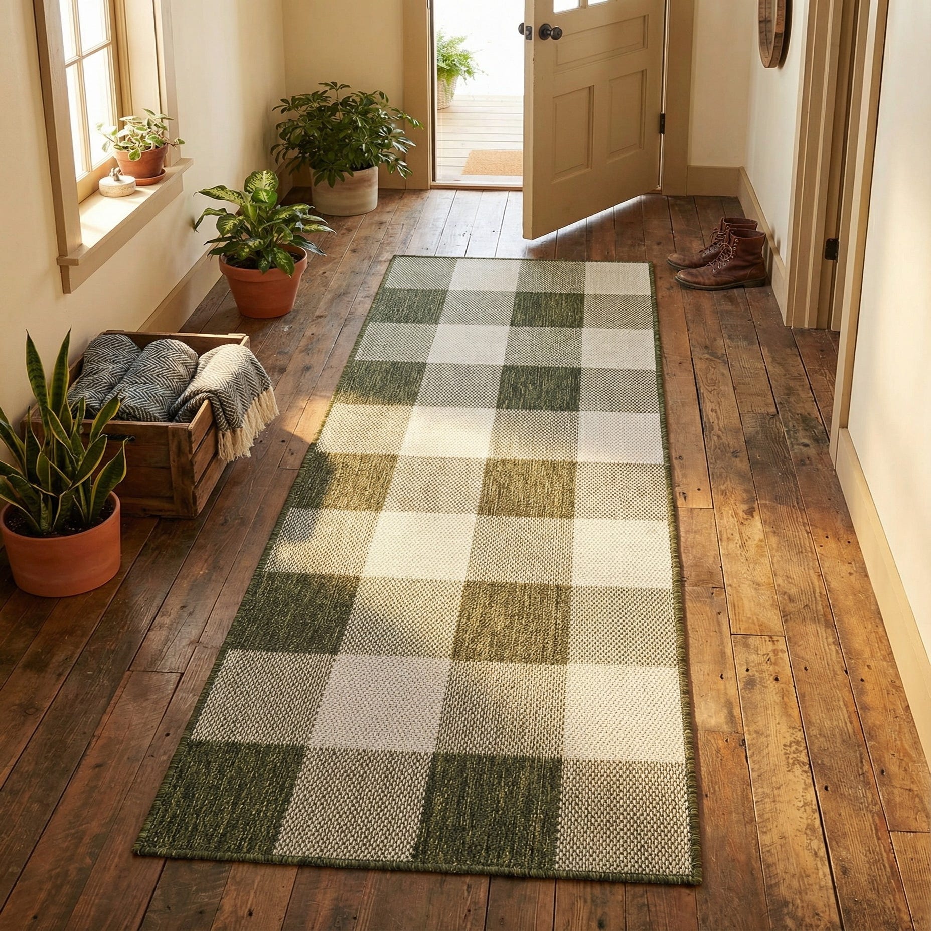A 5 ft runner rug featuring a modern checkered pattern in varying shades of green, ideal for a patio or hallway.