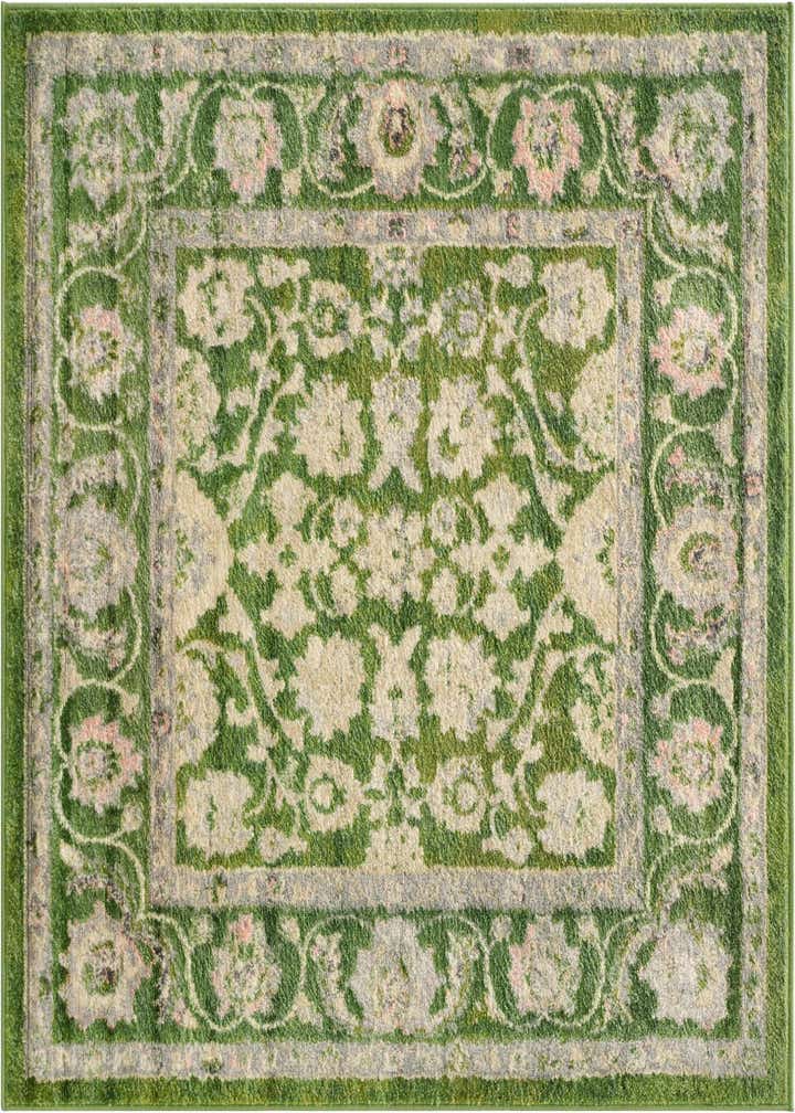 Primary color is Green. Colors in this rug include: Green, Gray, Hunter Green, Ivory, Pink.