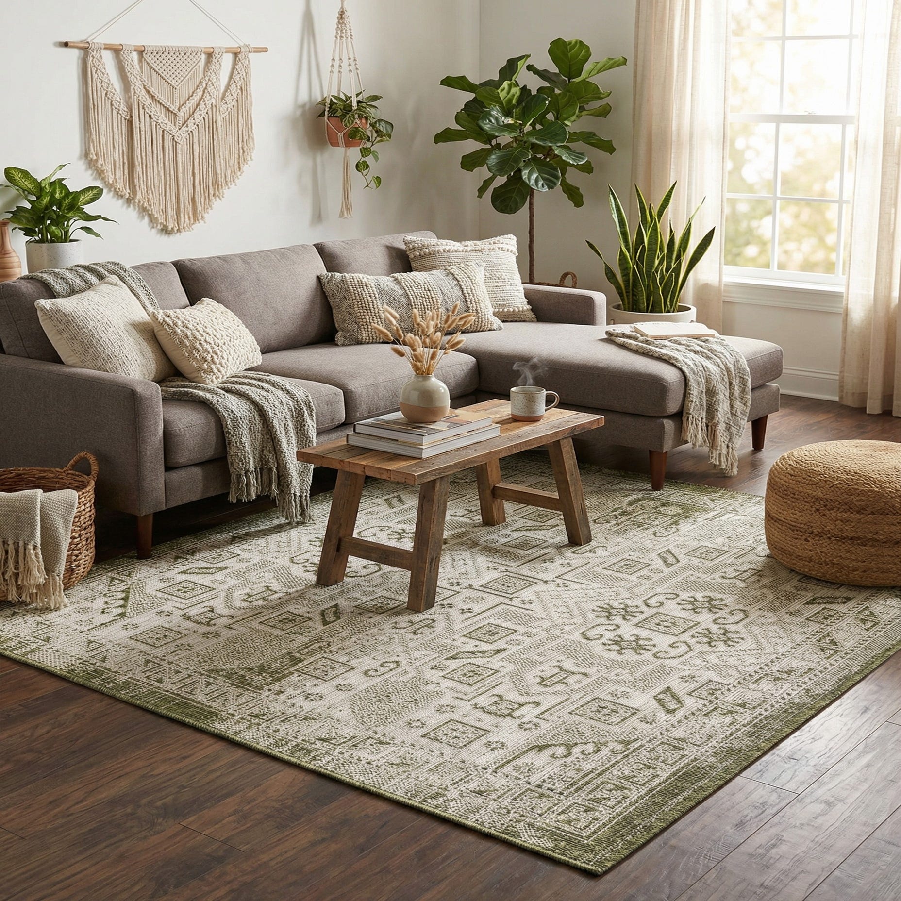 A 5' 3 x 5' 3 square green and white Southwestern rug with a tribal pattern, suitable for indoor or outdoor use.