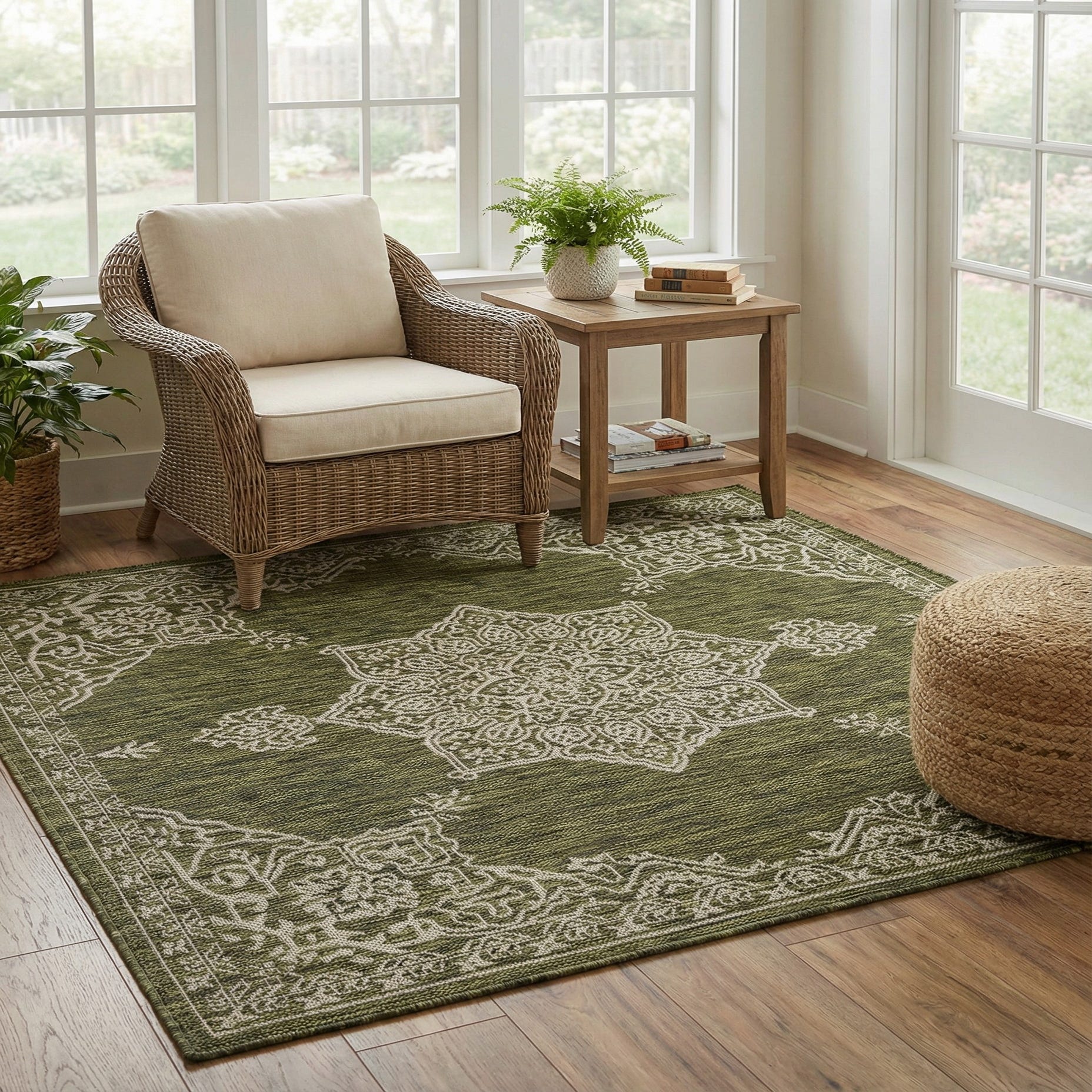 This Outdoor Traditional Collection rug features a 5-foot square machine-woven design of 100% polypropylene that offers durability and a versatile aesthetic. The rug presents a green background with an ivory traditional pattern, providing a balanced contrast that captures attention without overwhelming. The flatweave construction ensures a smooth texture, suitable for high traffic areas and seamless integration with various furniture layouts.