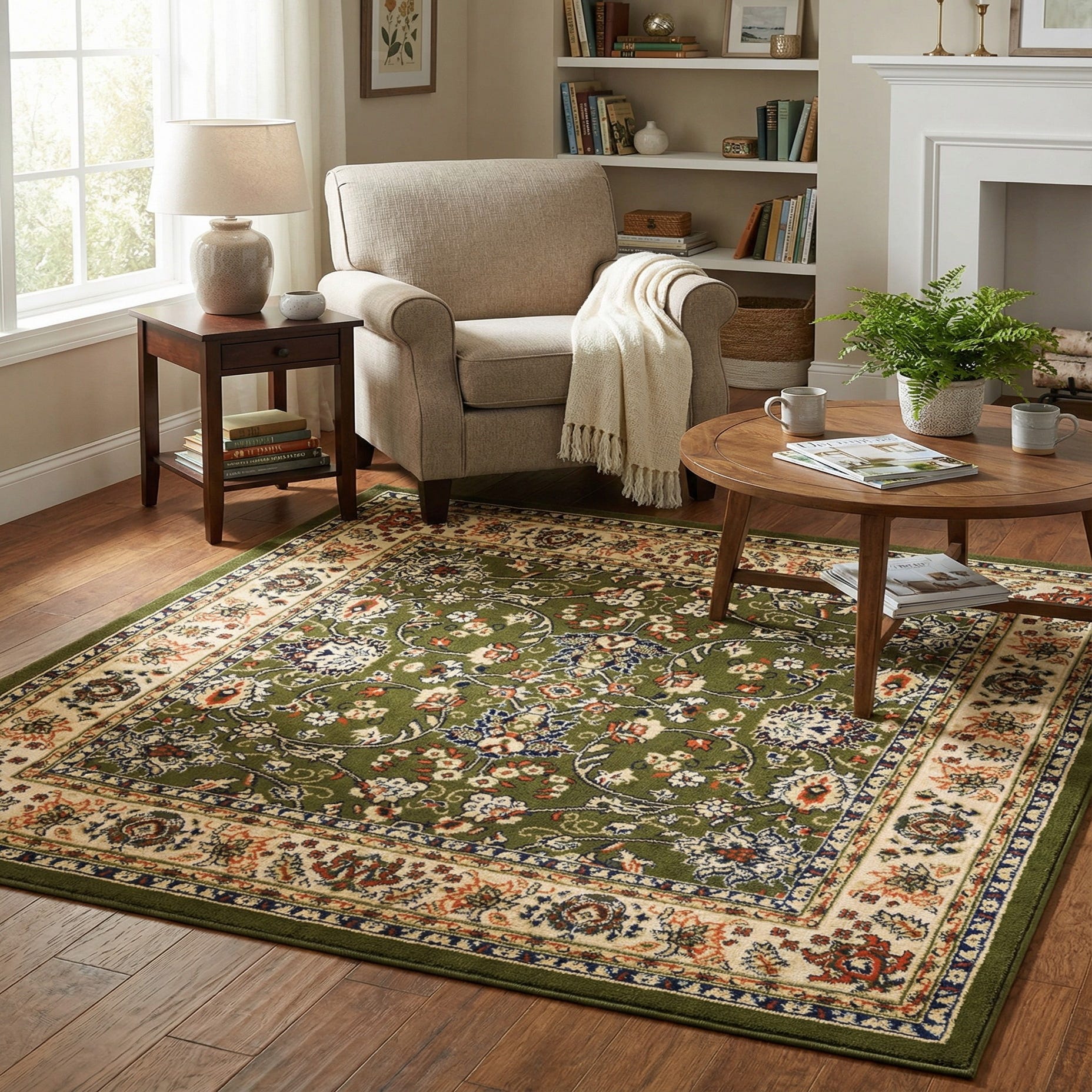 This rug works well in traditional and transitional interiors — place it beneath a coffee table in a living room with warm wood tones or anchor a reading nook with leather seating and cream upholstery. It also complements layered looks with natural fibers and terracotta accents, and functions nicely in entryways or dining areas where a refined, grounded aesthetic is desired.