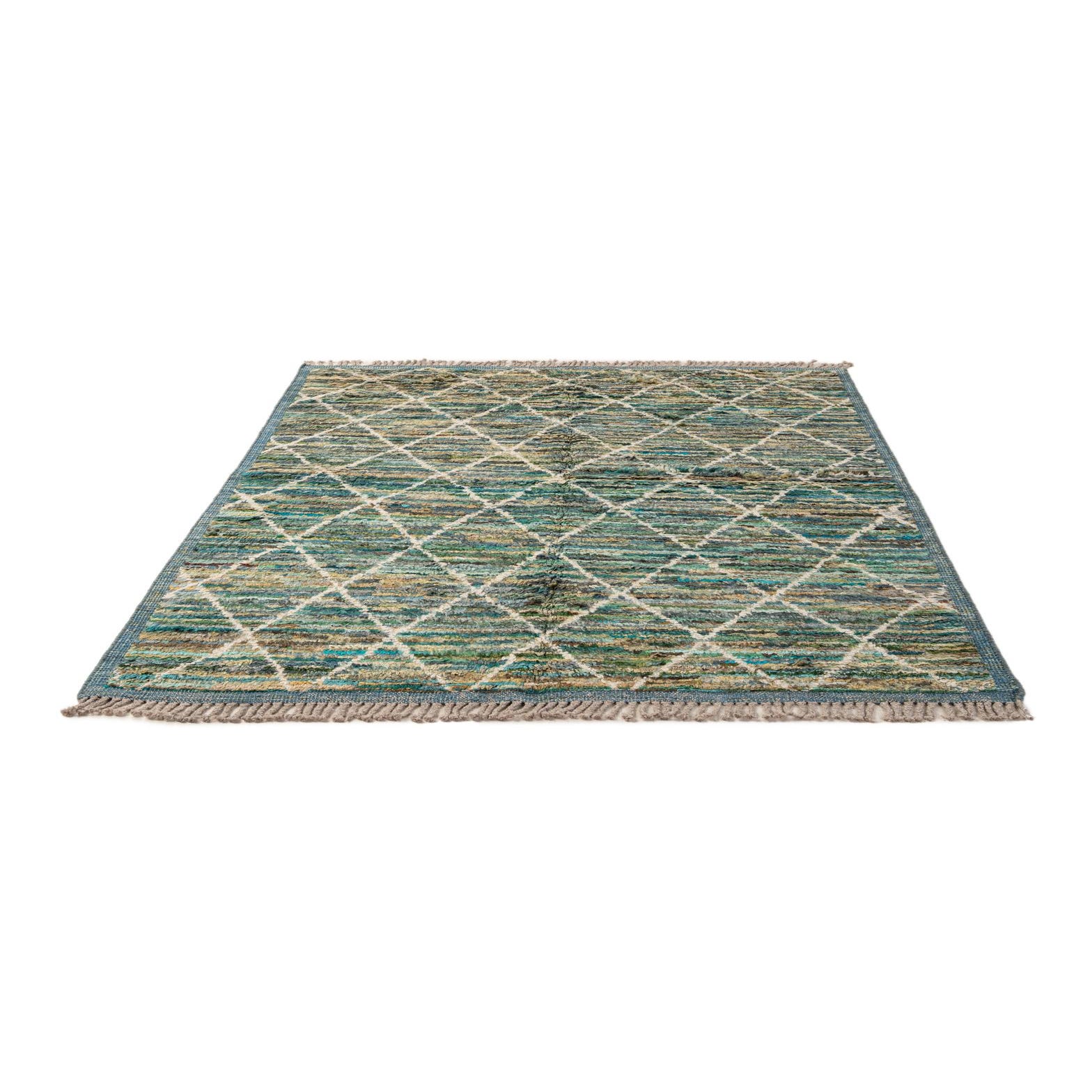 A 5x7 rectangular Moroccan tribal rug in varying shades of green, blue, and brown with a cream diamond pattern and fringed ends.