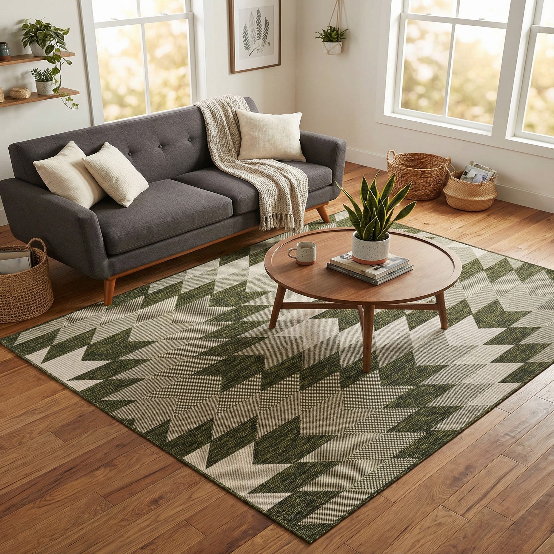 Machine made from 100% polypropylene, this piece works well where a contemporary, easy-care floorcovering is needed — think covered patios, sunrooms, entryways, or a casual dining area. Its graphic scale pairs nicely with mid-century or modern furnishings, natural-wood tables and rattan accents, or monochrome outdoor furniture to balance pattern and color. The Green background anchors a space while the Ivory chevrons brighten and add movement, making the rug a straightforward choice for clean, modern interiors and relaxed outdoor rooms.