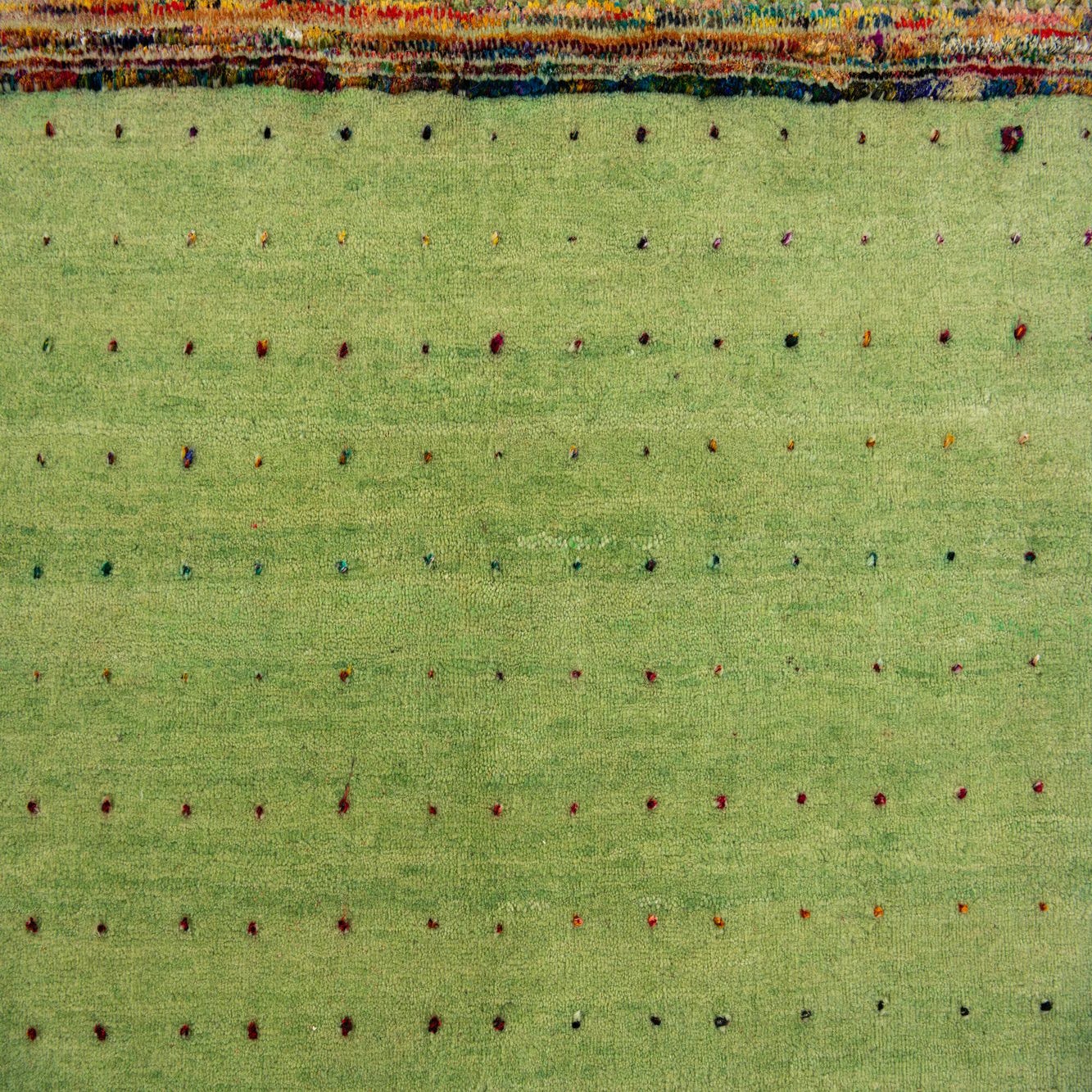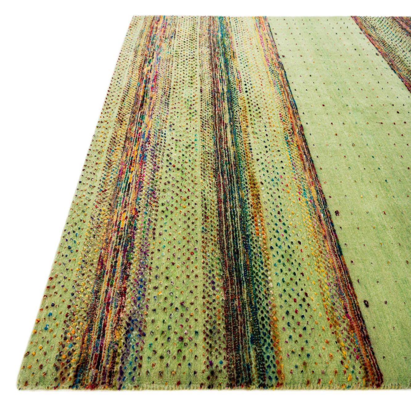 A 5x7 rectangular green wool rug with a modern abstract pattern featuring horizontal stripes and small, colorful dots.