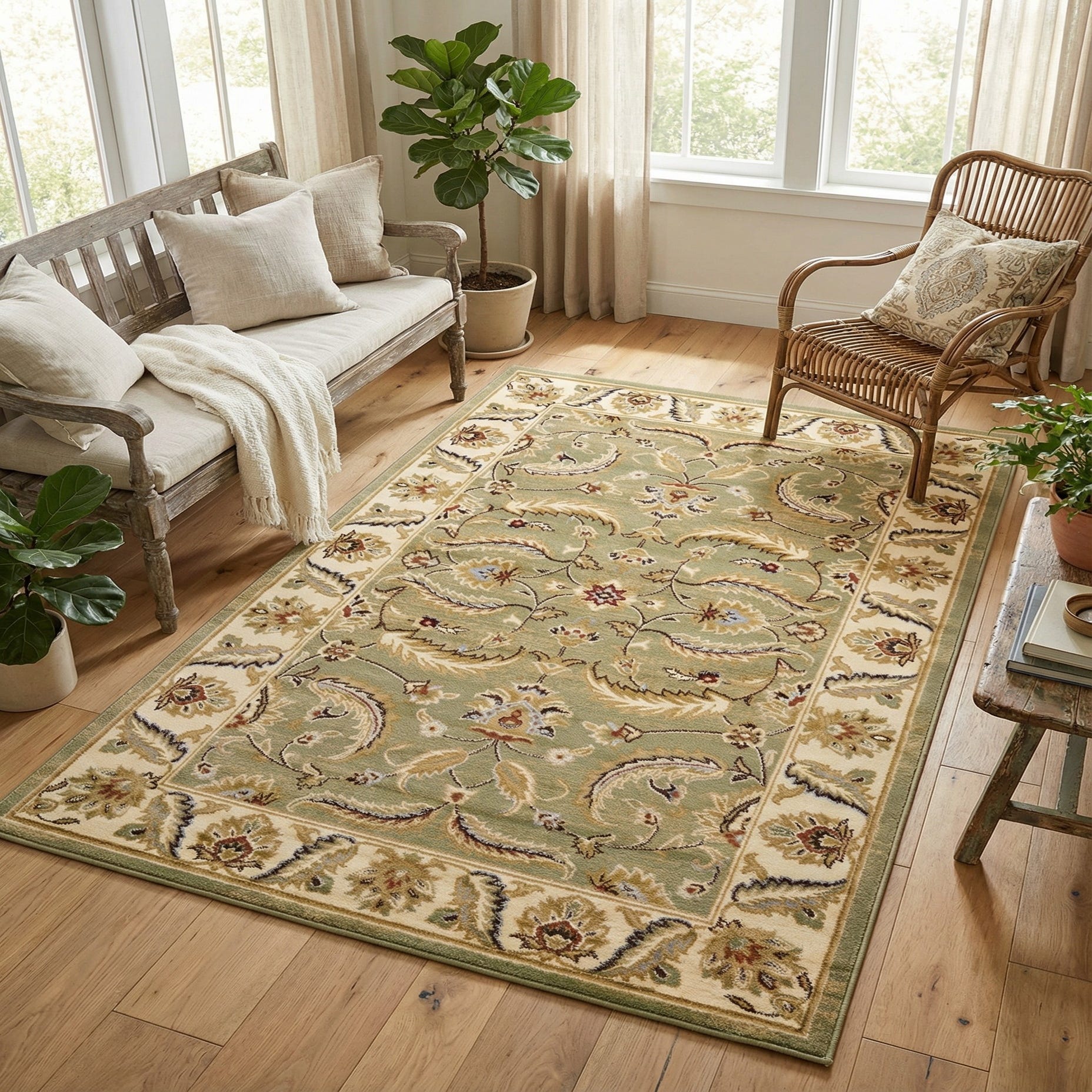 Machine-made from 100% polypropylene, the rug has a low-to-medium pile that feels soft underfoot with a firm, even surface that showcases the pattern clearly. Its texture and colorway suit a range of interiors: place it under a living-room coffee table, anchor a dining area with warm wood furniture, or layer it in a bedroom to add calm, traditional character. The palette pairs well with neutral linens, warm wood tones, navy or muted blues, and classic or transitional furnishings.