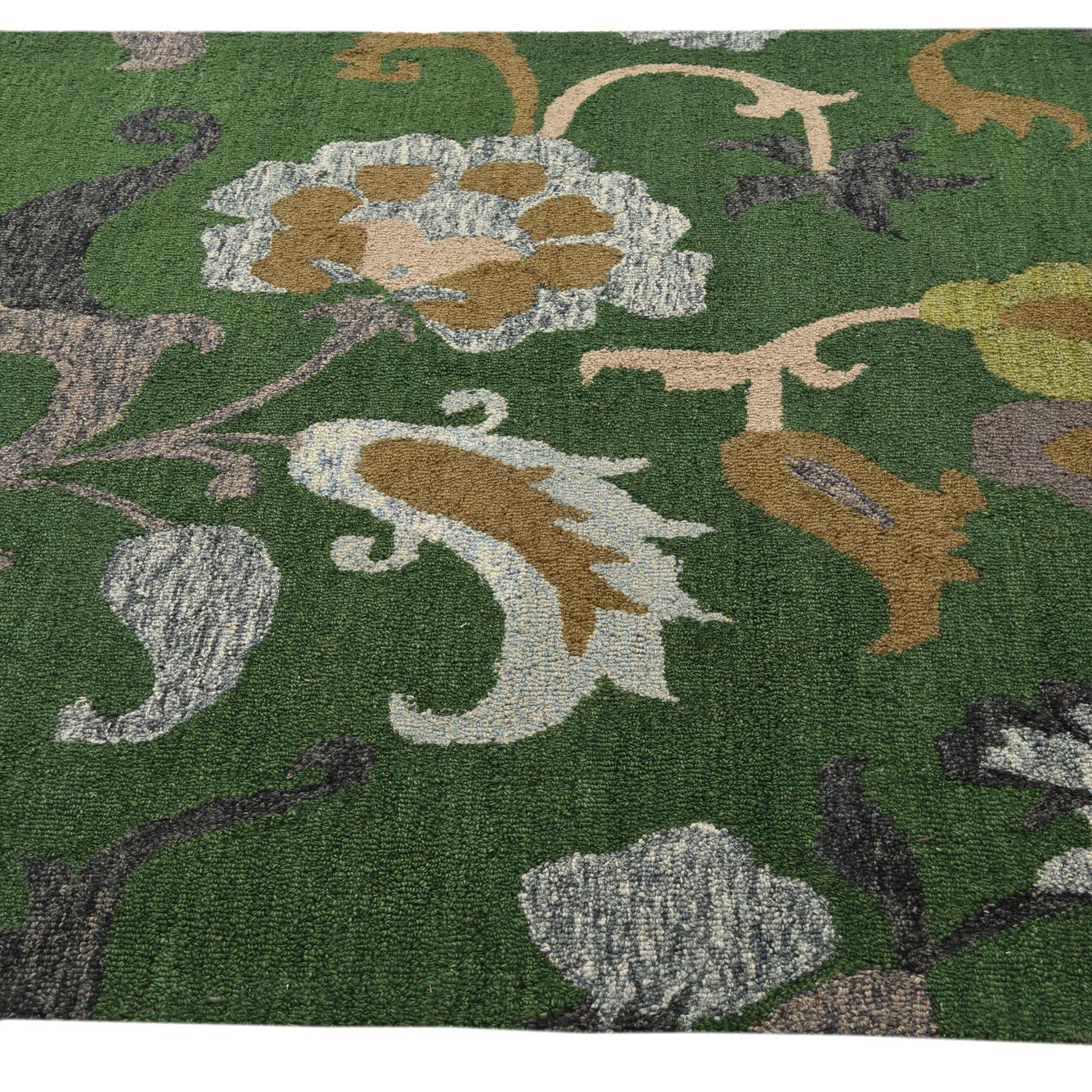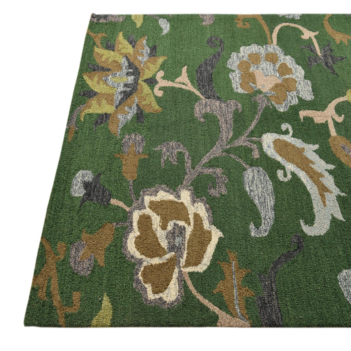 A 5x8 rectangular green area rug with a high pile, featuring a traditional floral pattern in muted greens, browns, and blues.