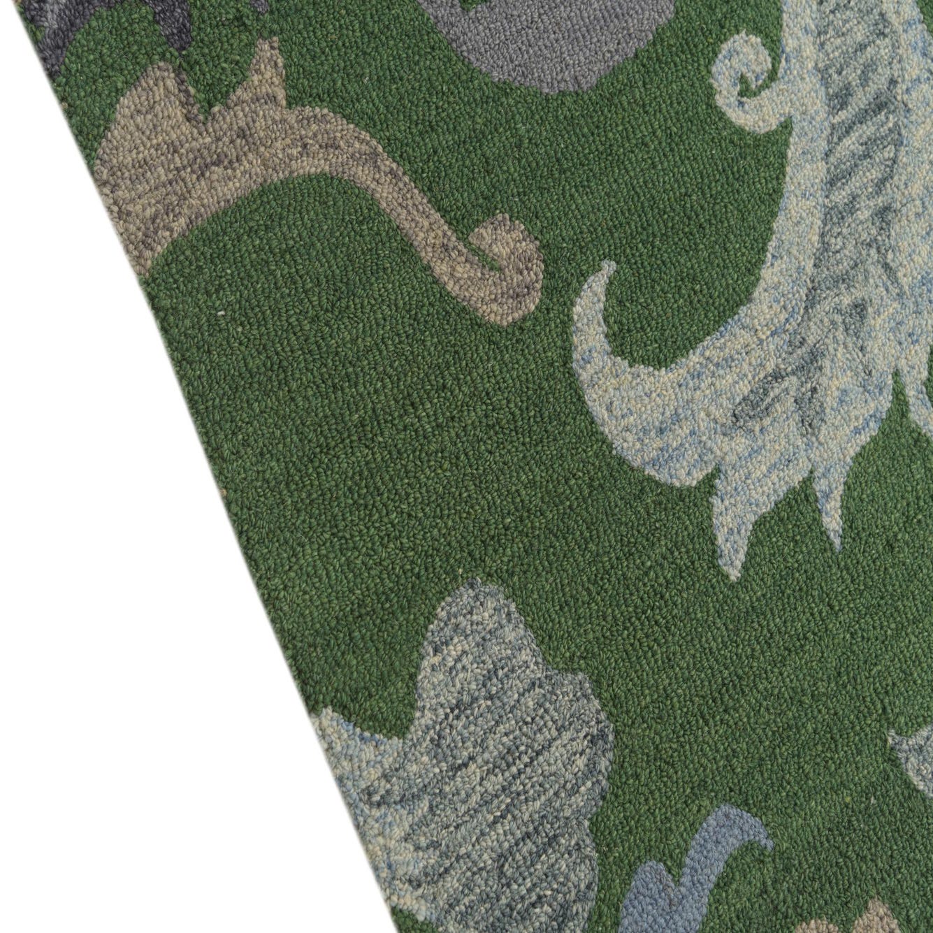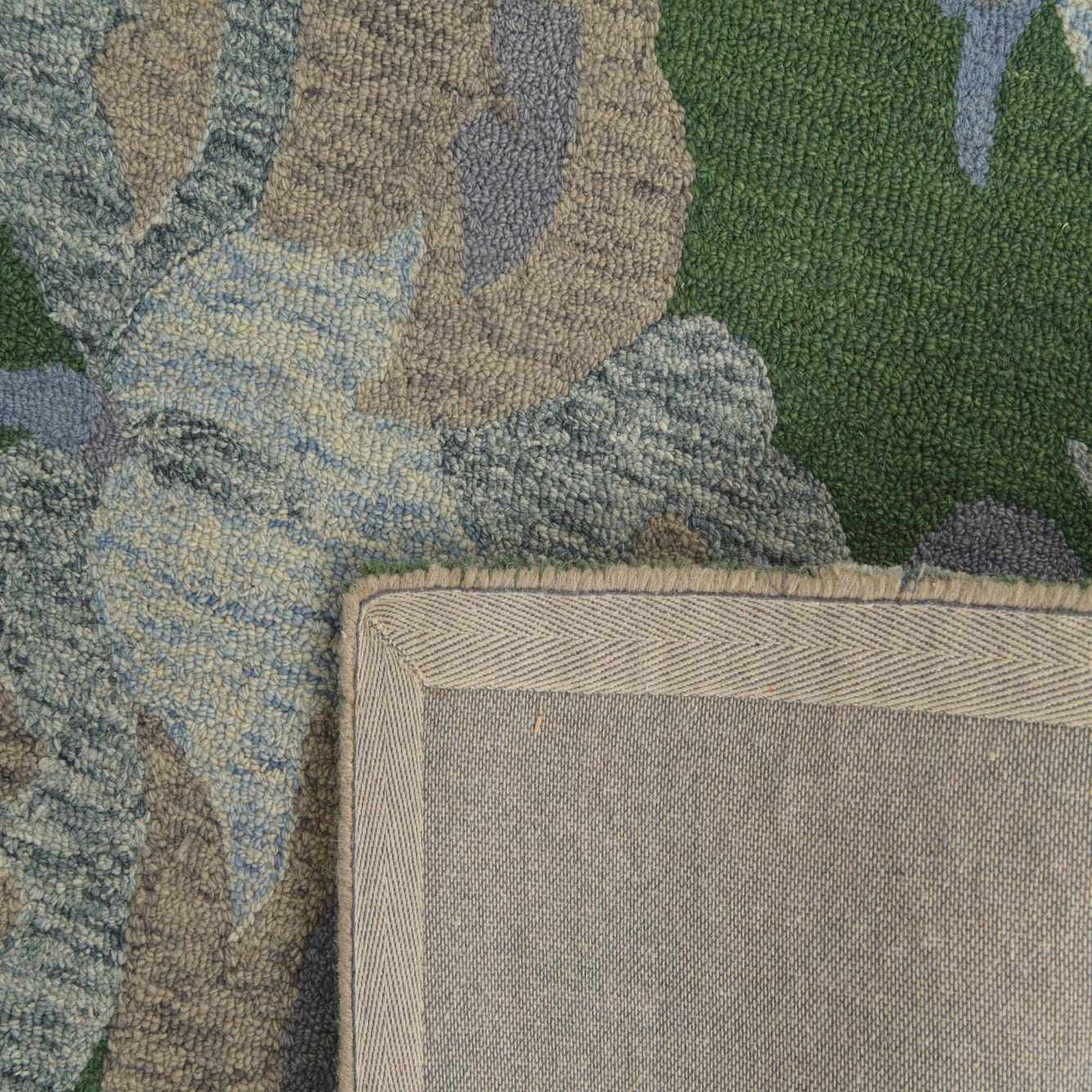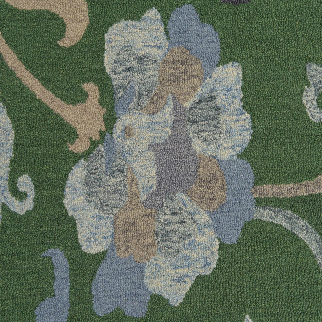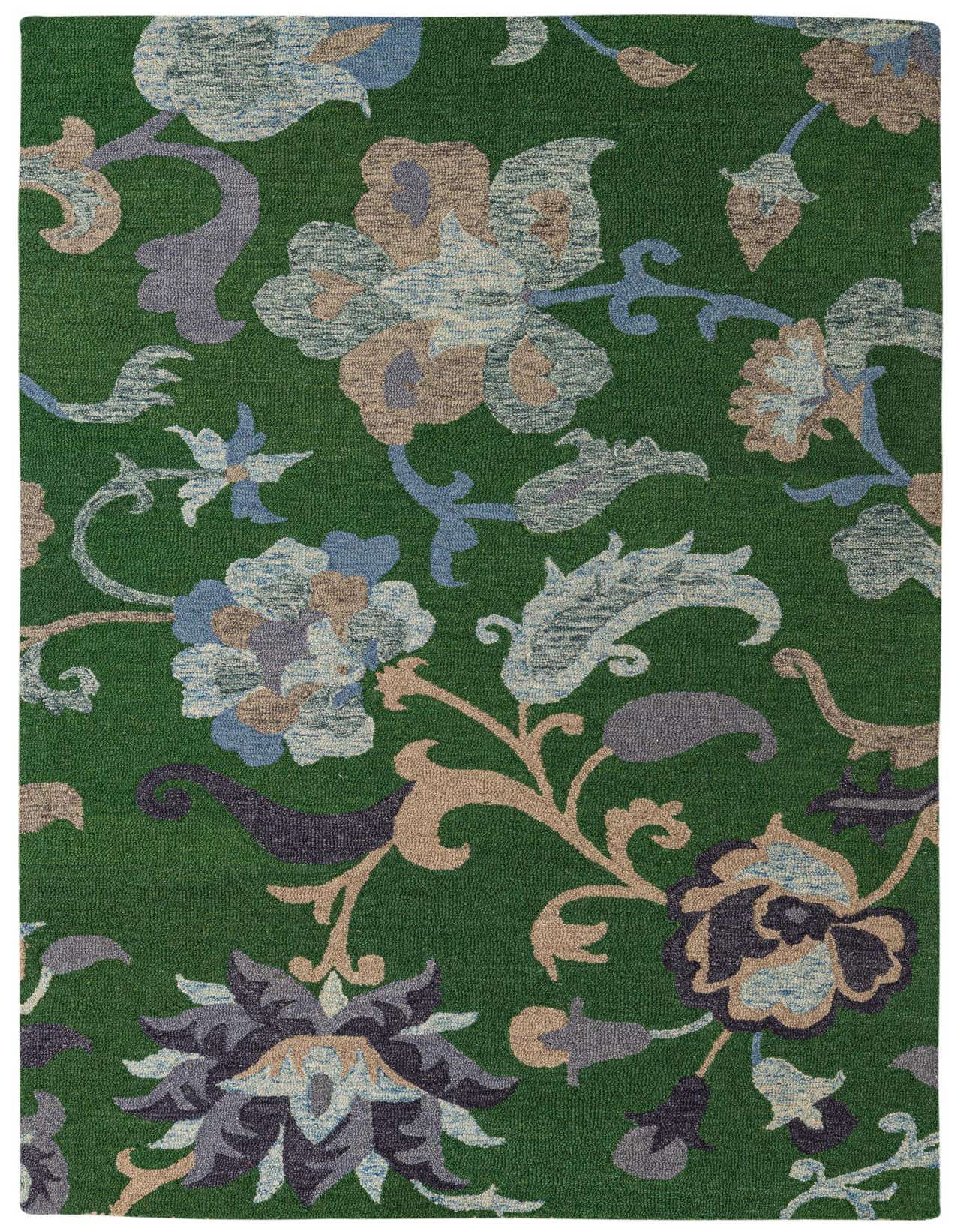 Primary color is Green. Colors in this rug include: Green, Light Blue, Light Brown, Navy Blue.