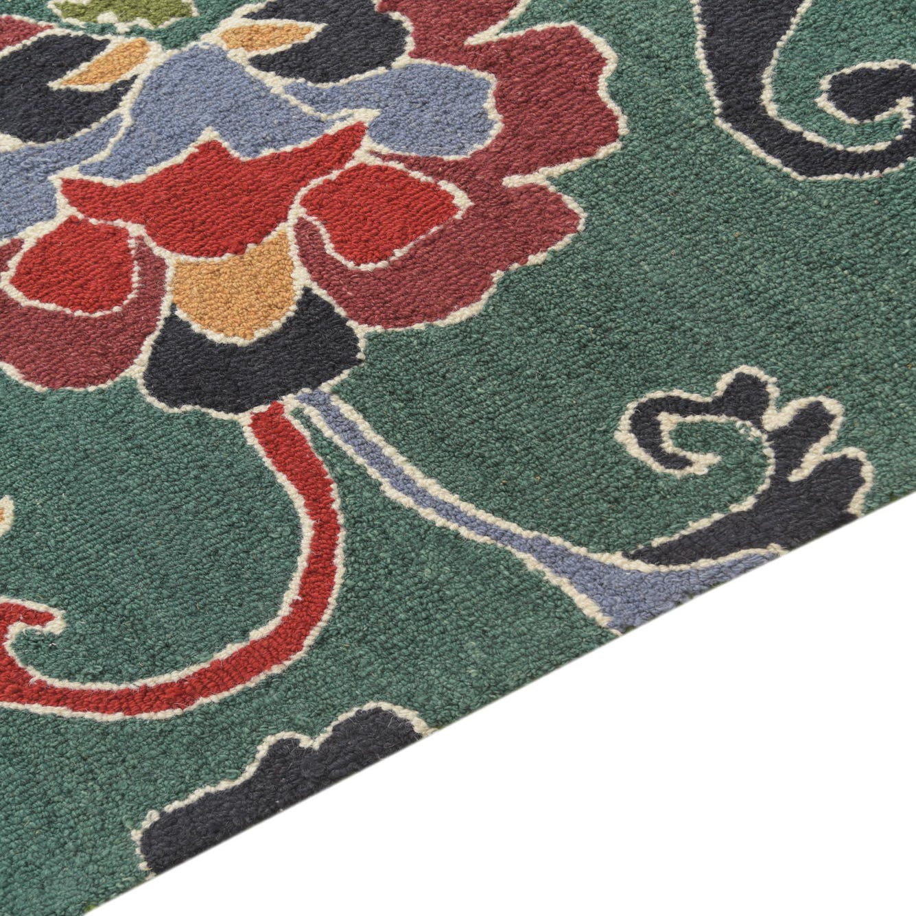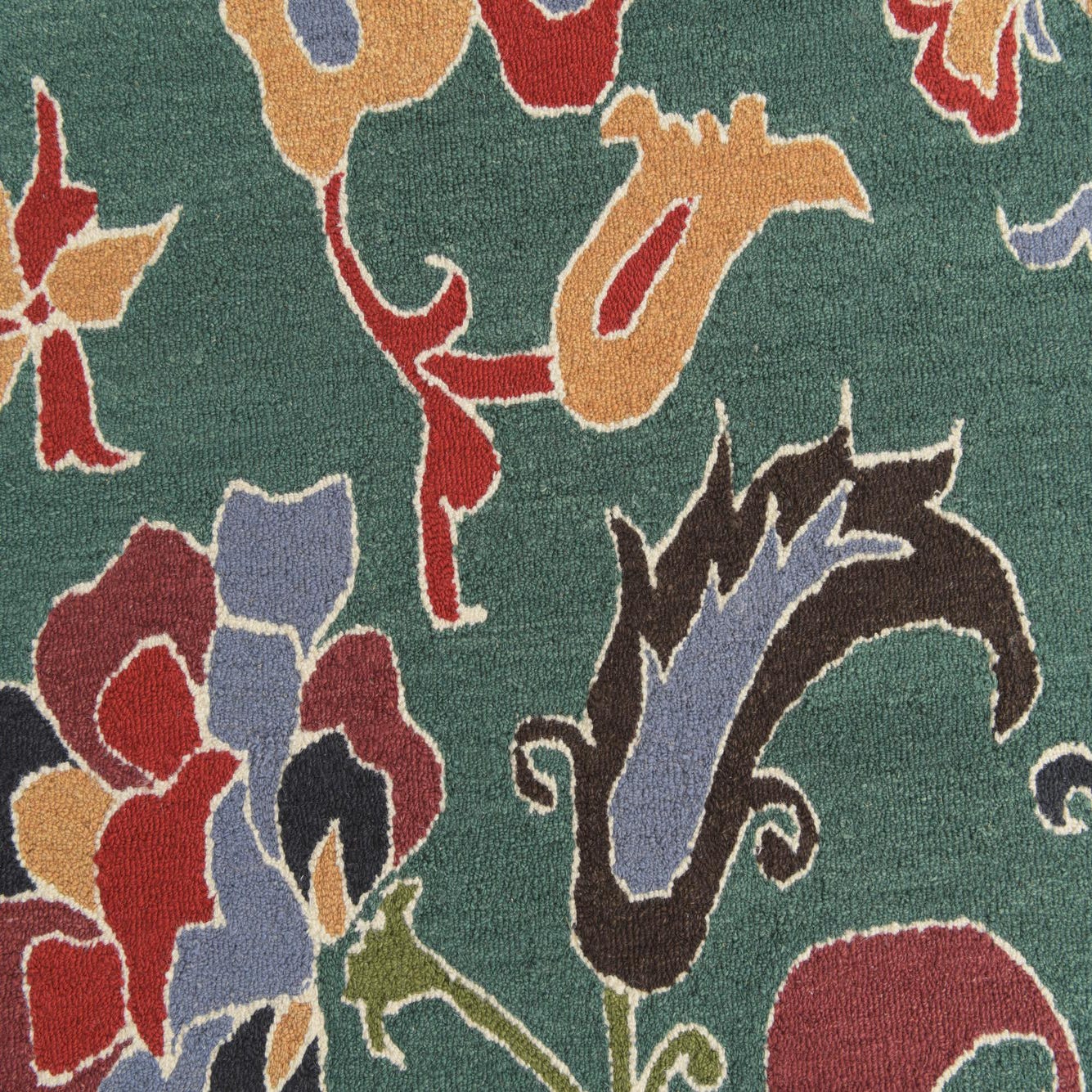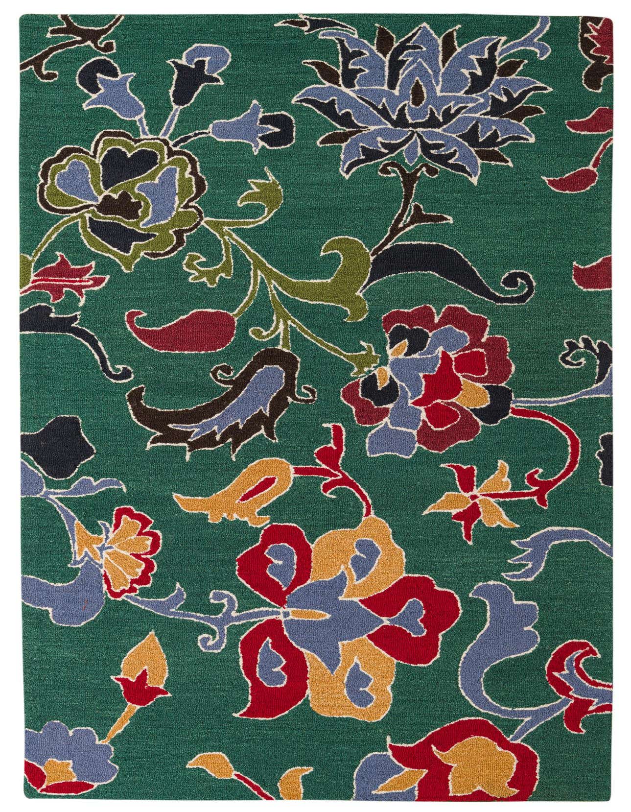 Primary color is Green. Colors in this rug include: Green, Ivory, Red, Light Blue, Olive, Navy Blue, Gold.