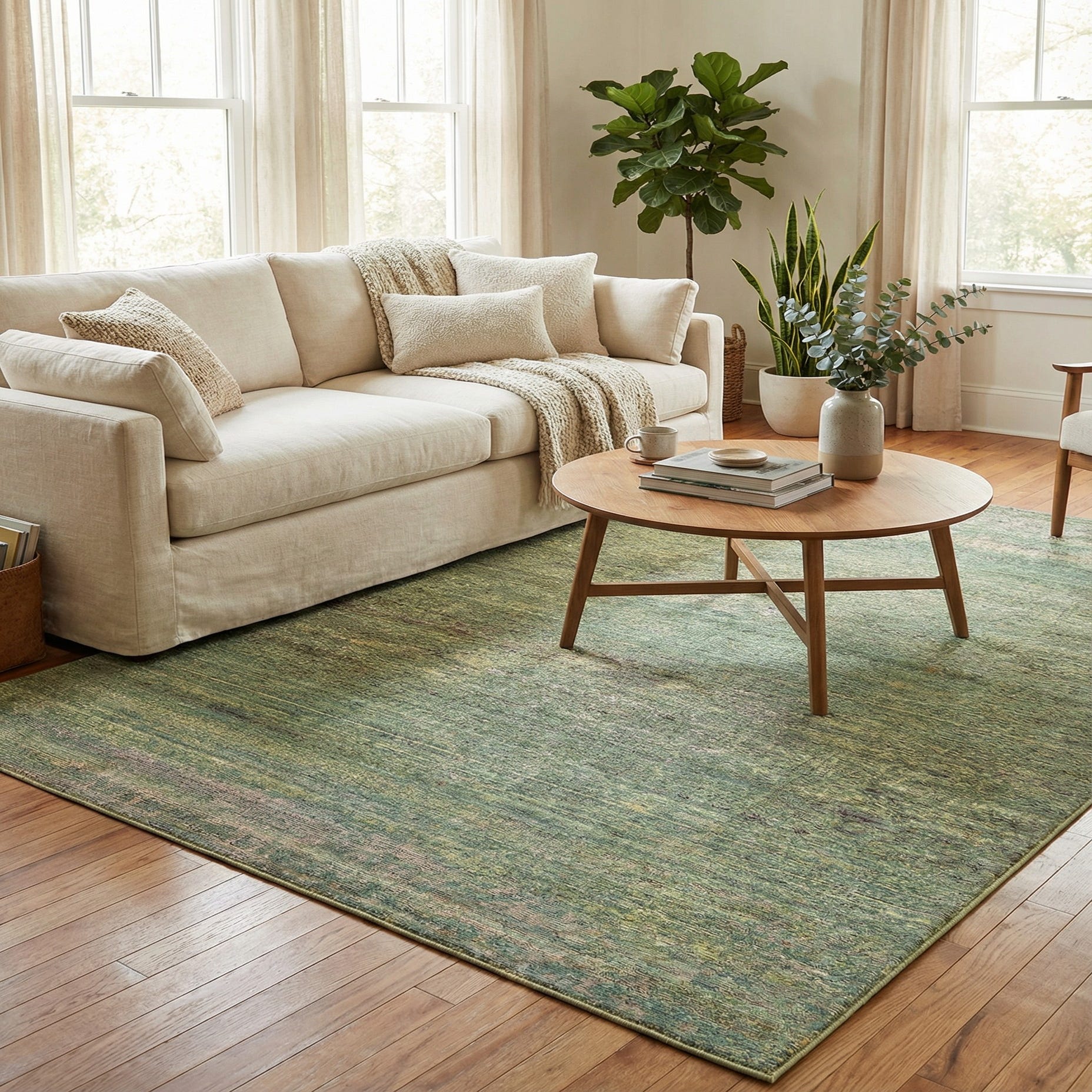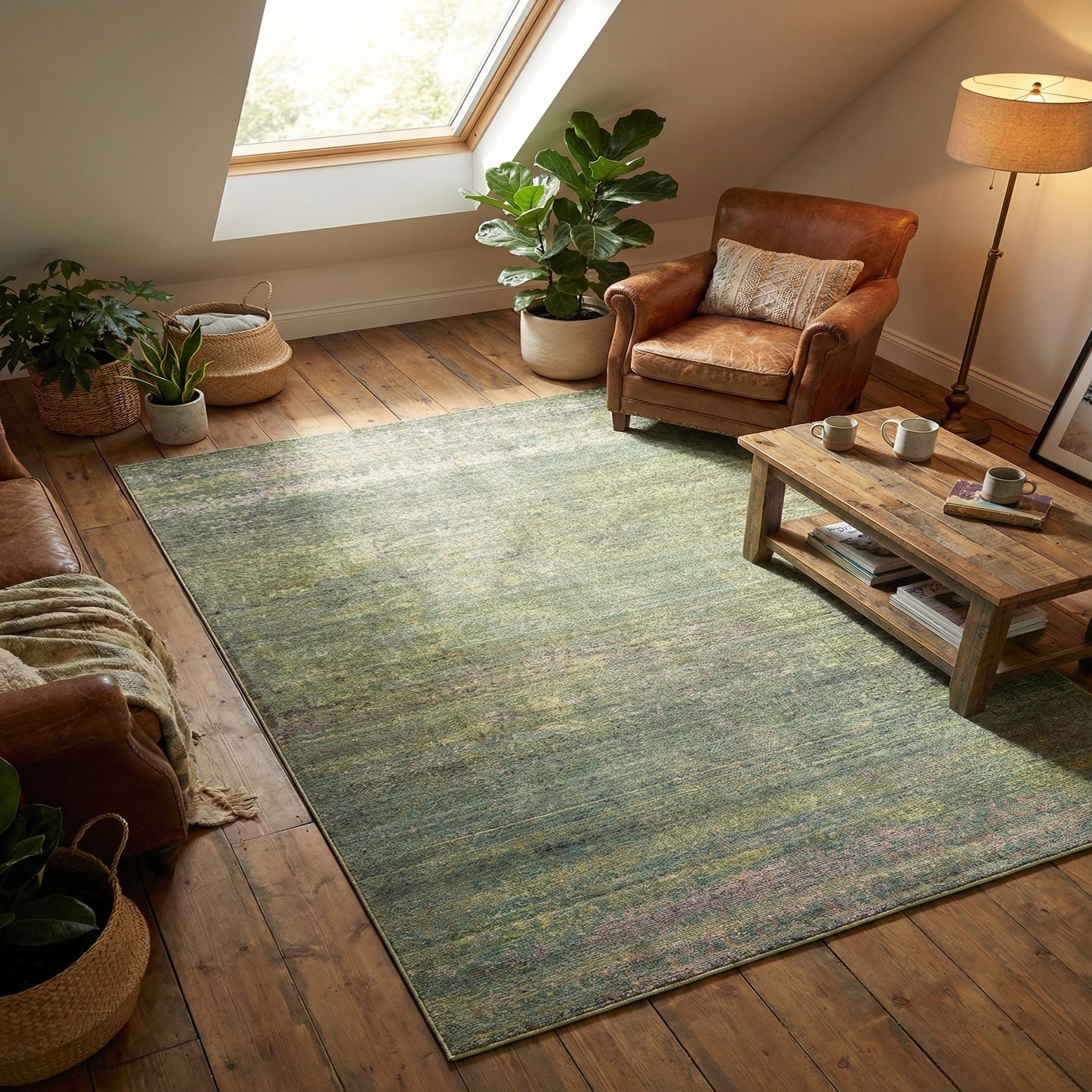 A soft, tonal field of green forms the backdrop for a gently distressed, abstract pattern with subtle horizontal striations. Flecks of beige, light blue, olive, orange, red, burgundy, and yellow are woven through the surface, creating a layered, space-dyed effect that gives the rug visual depth without a dominant motif. The overall style balances modern and vintage influences, offering an understated, versatile look that complements a range of interiors.