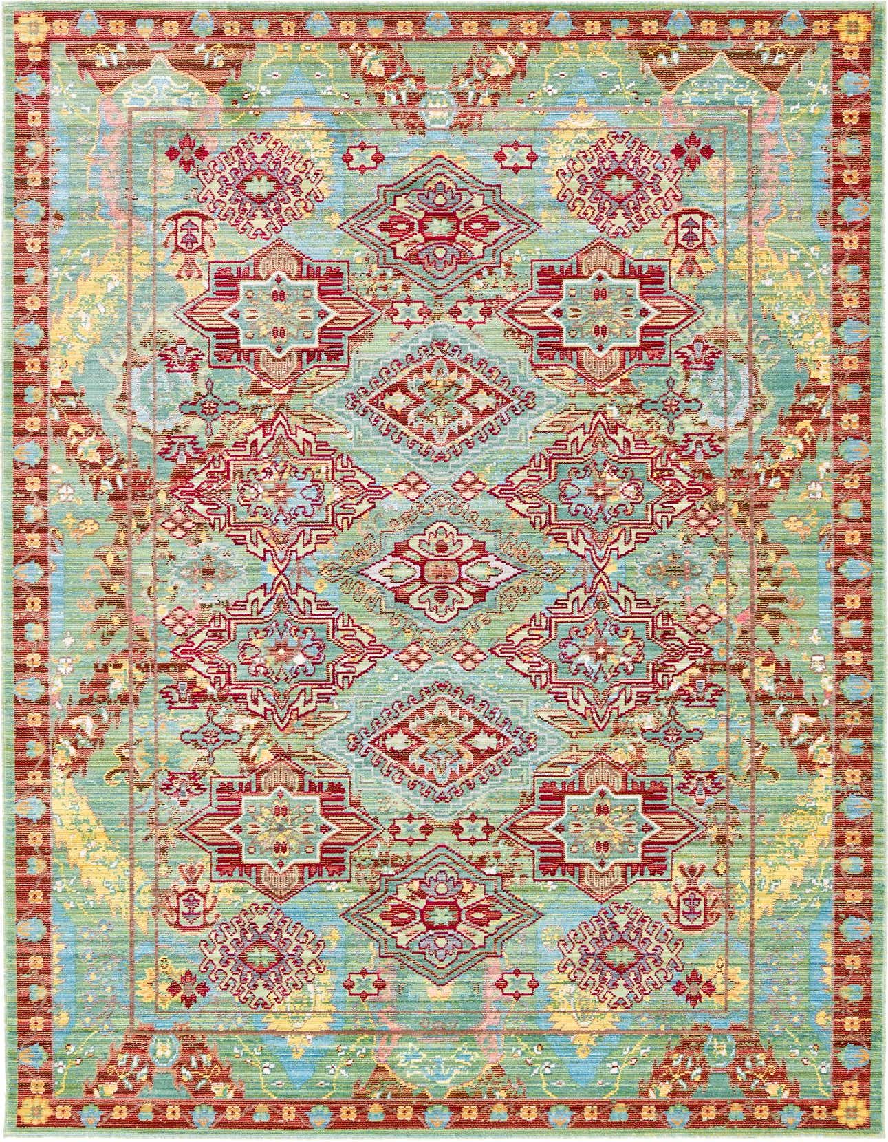 Primary color is Green. Colors in this rug include: Green, Burgundy, Gray, Light Blue, Peach, Puce, Yellow.