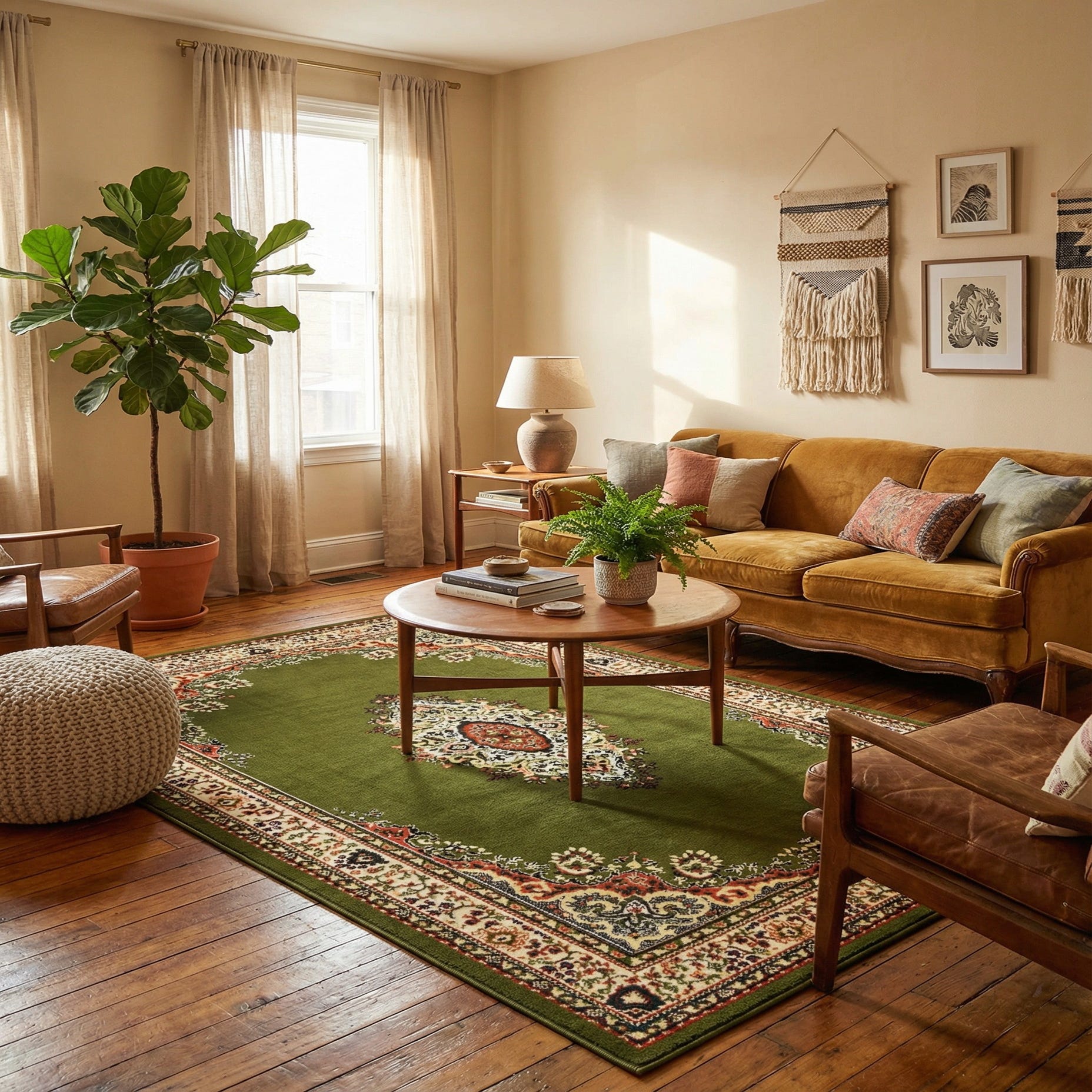This piece works well as a grounding element in a traditional living room or study, anchored beneath a coffee table or in front of a sofa, and it also dresses a dining area or entry with classic character. Pair it with warm wood furniture, leather seating, navy or cream upholstery, and terracotta accents to echo the rug’s palette; it also complements transitional interiors where a timeless pattern adds structure to layered decor.