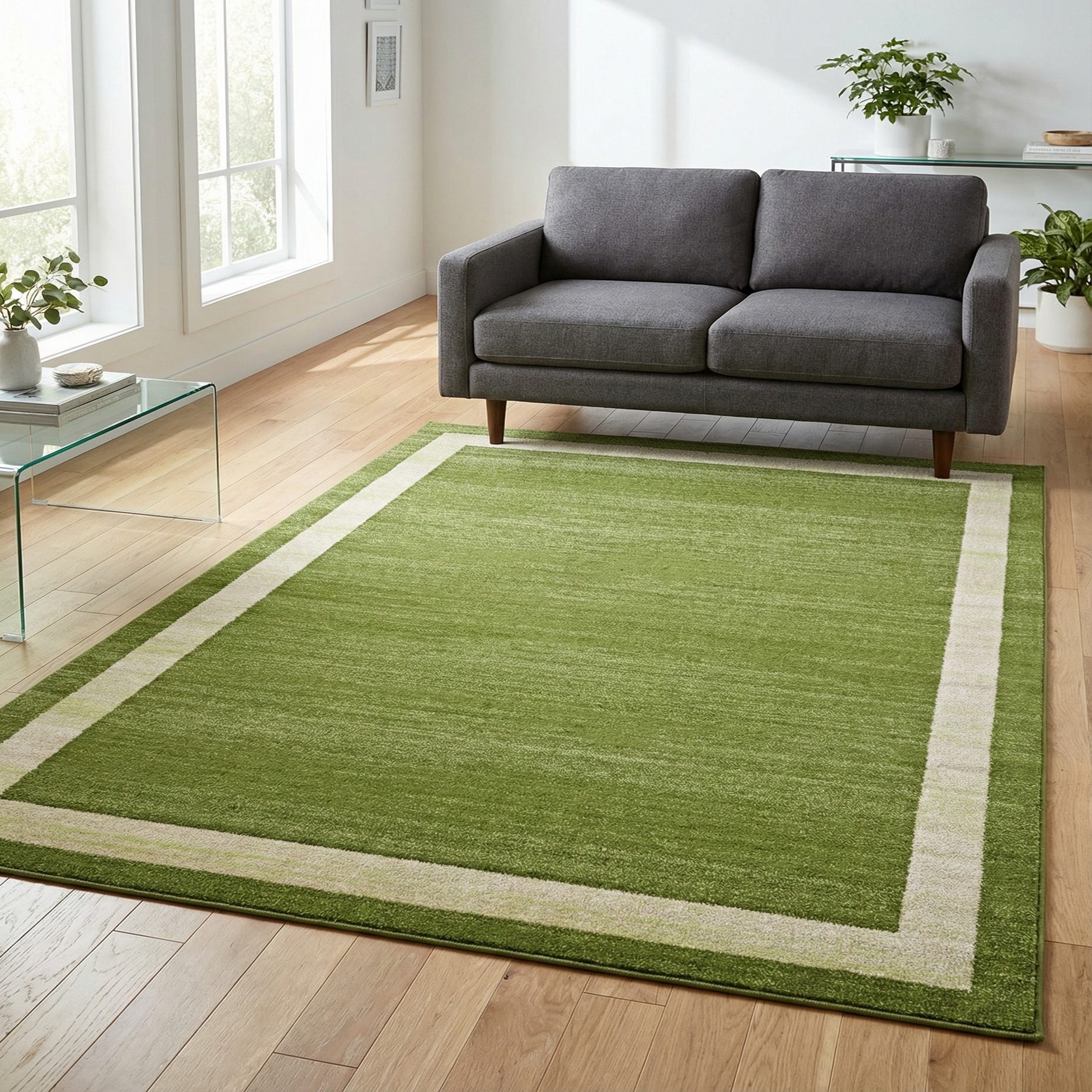A clean, modern bordered design gives this rug a calm, structured look. A rich green field is interrupted only by an inner ivory band and a slim green outer edge, creating a defined frame that reads contemporary and understated. The green pile shows subtle tonal variation and a soft, brushed surface that adds visual depth without a busy pattern.