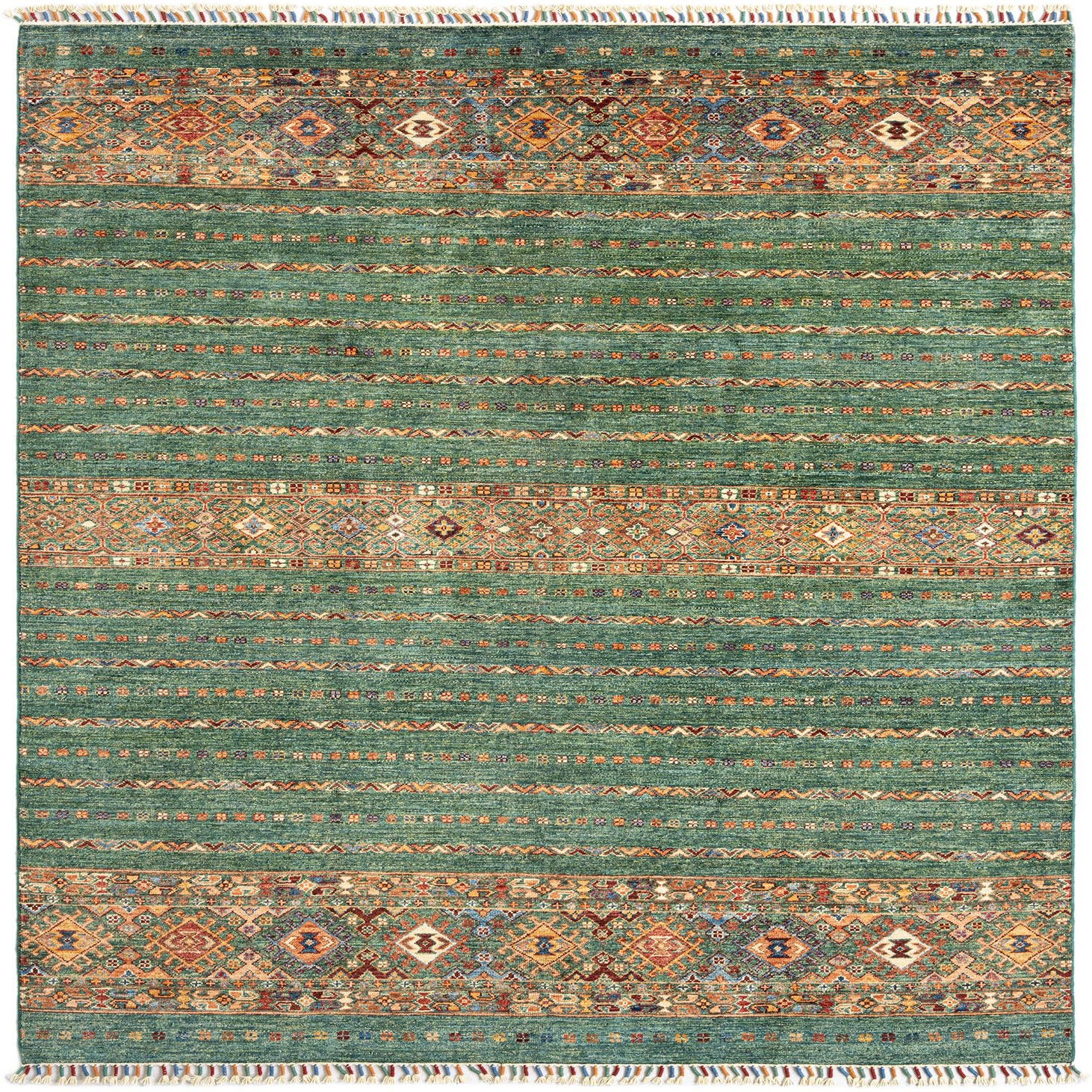 Primary color is Green. Colors in this rug include: Green, Light Brown, Orange, Brown, Red.