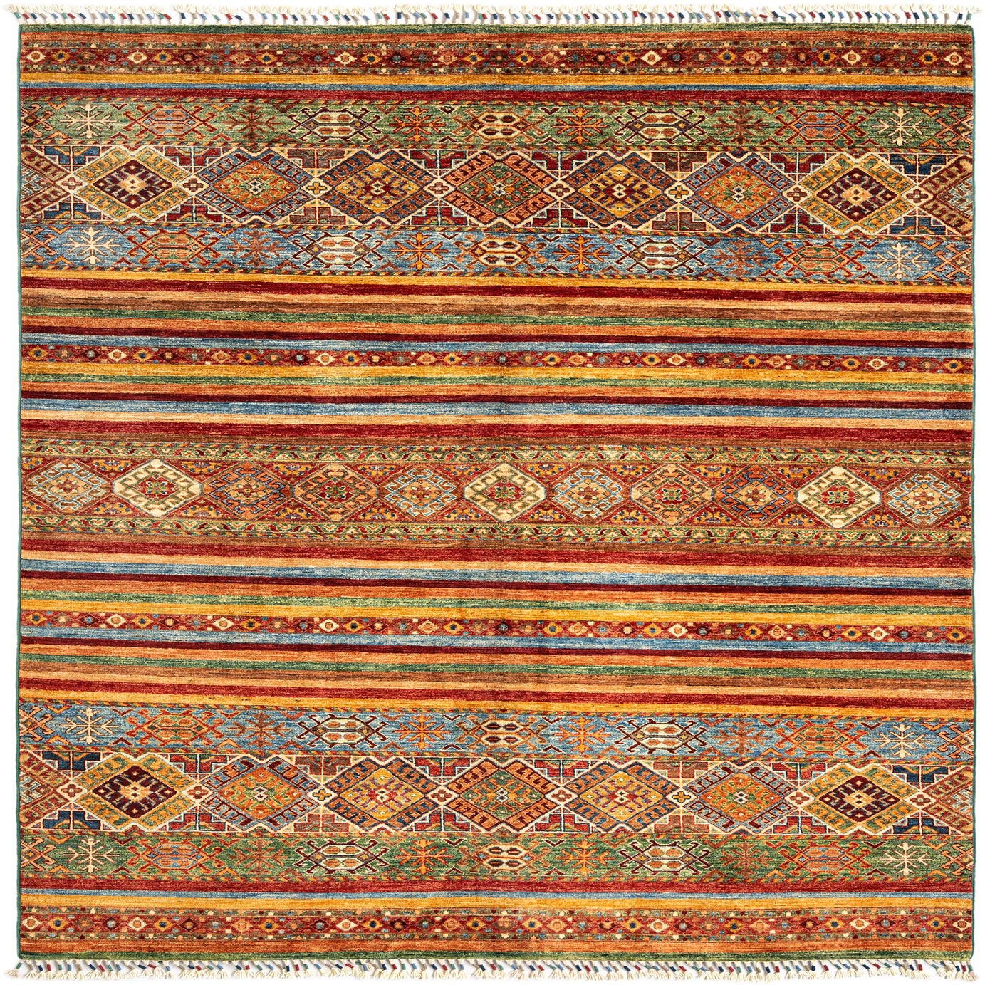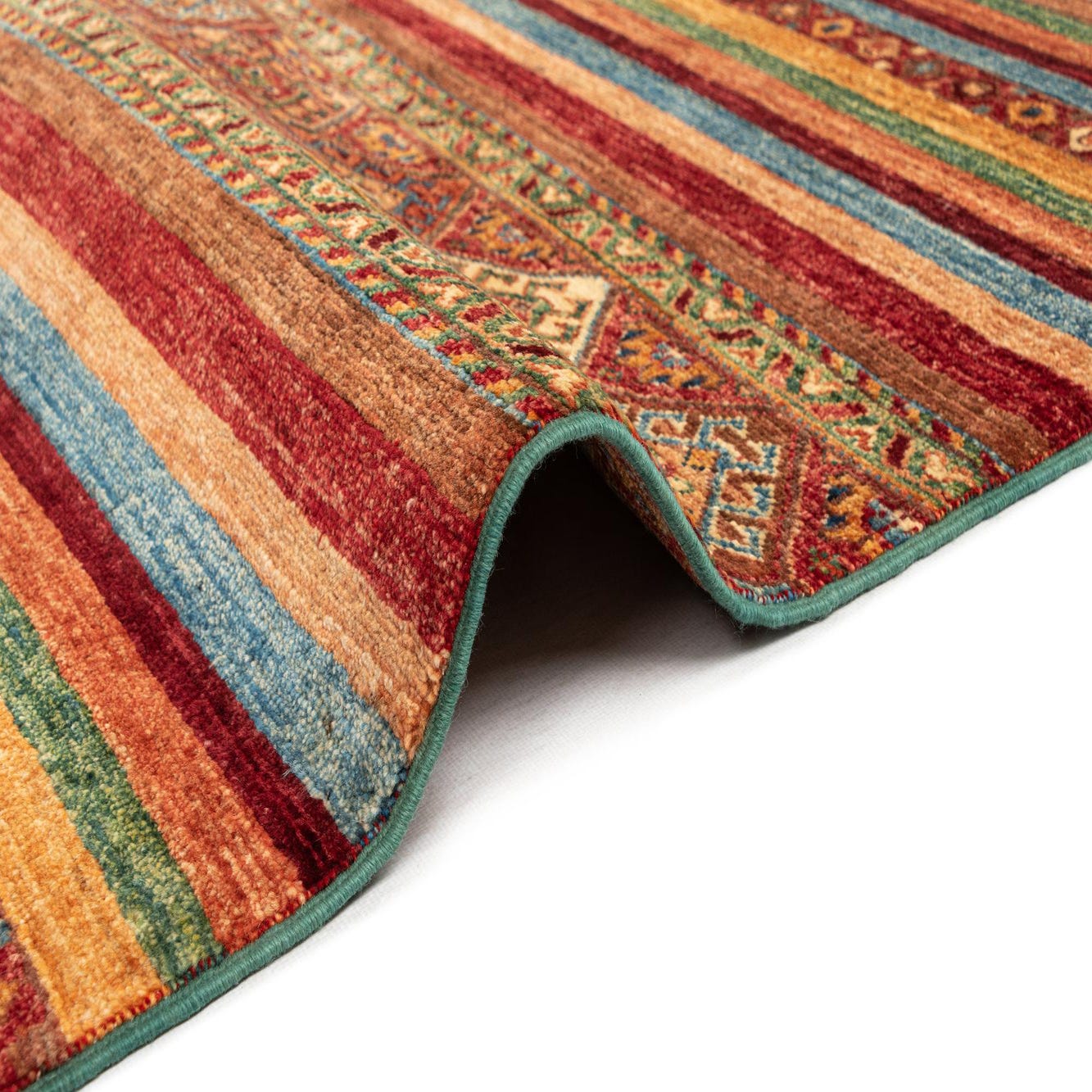 The Ariana Ziegler rug is a hand-made piece constructed from 100% wool, measuring 5x8 feet. It features a rich tapestry of patterns that elicits a sense of traditional craftsmanship. The primary green background provides a verdant canvas for the intricate design, which consists of a harmonious blend of geometric motifs and stripes. Accent colors include a warm palette of orange, brown, blue, cream, burgundy, and peach, which create a vibrant yet balanced visual appeal.
